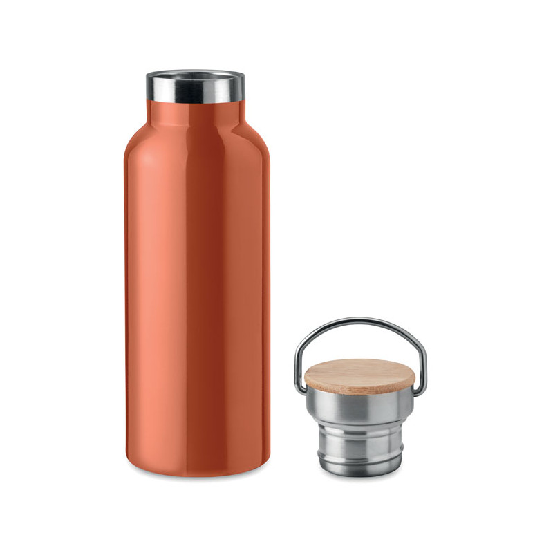 Double wall stainless steel insulating vacuum flask with lid in bamboo and carry handle. Capacity: 500 ml. Sublimation print available on white item only. Leak free.