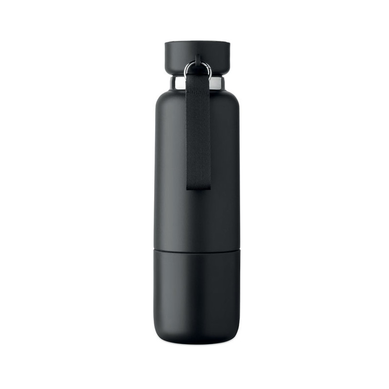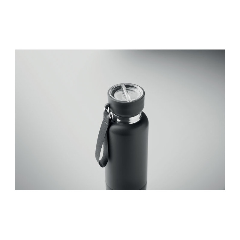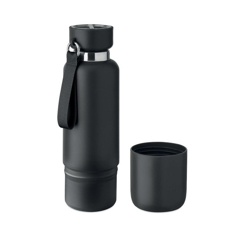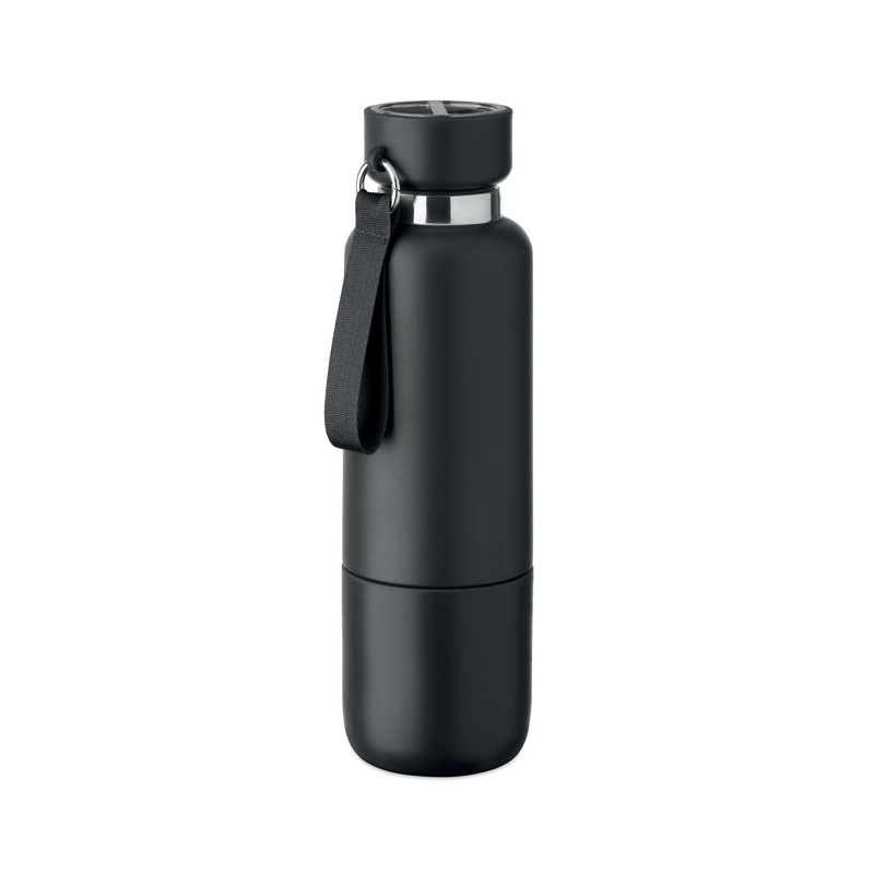 Double-walled insulated bottle made from 90% recycled stainless steel and 10% stainless steel, with integrated handle on the PP lid. Leak-proof. Bottom cup included. Capacity: 500 ml.