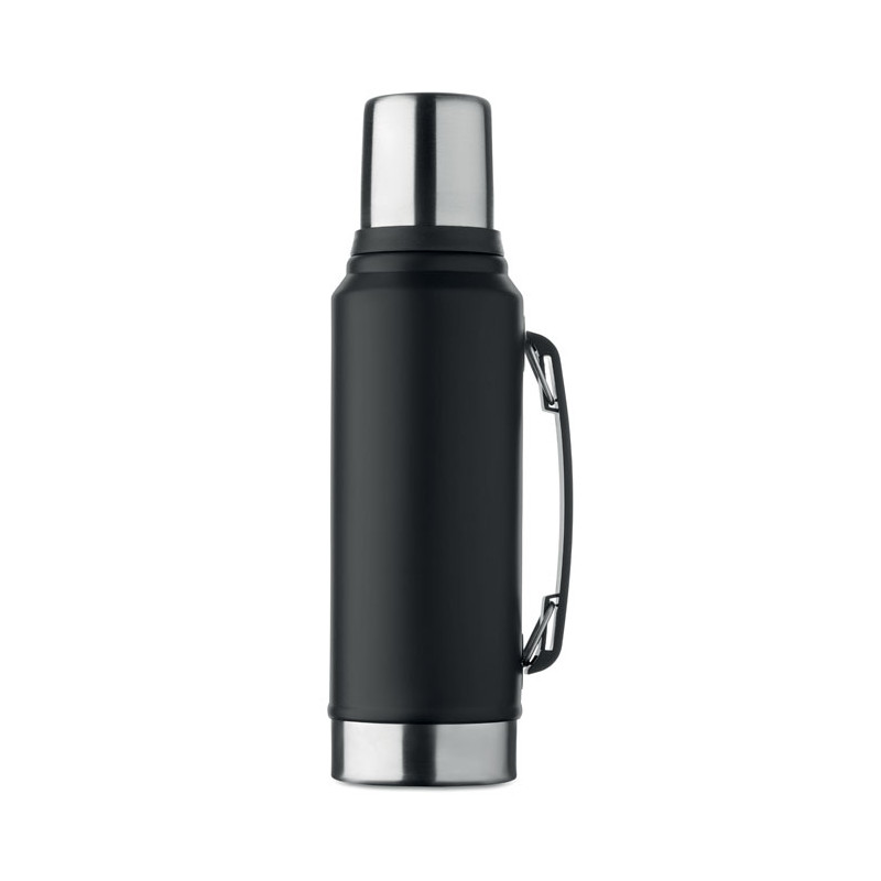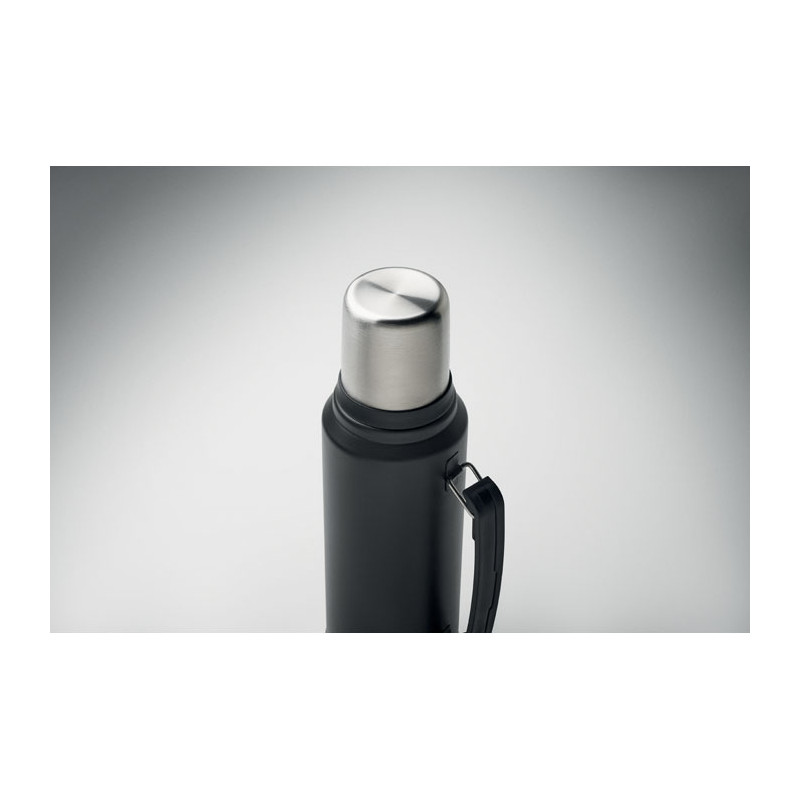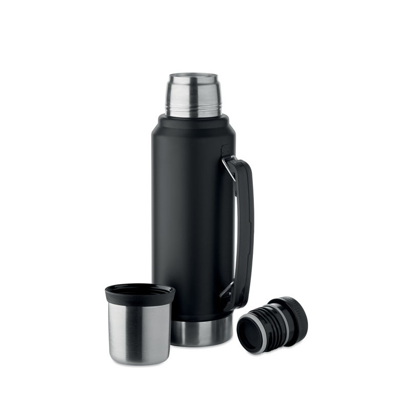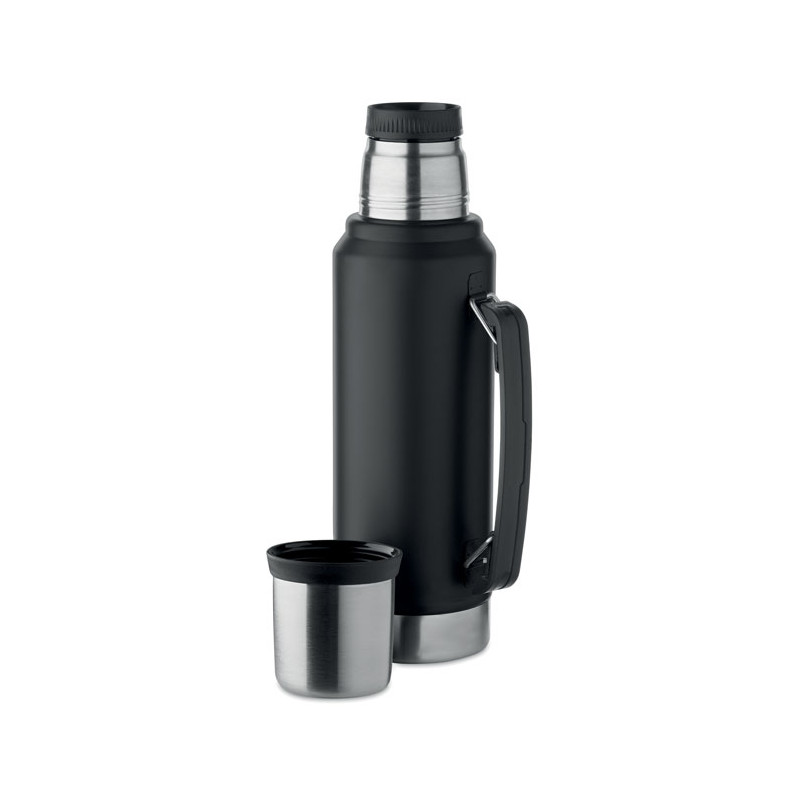 Double wall vacuum insulating bottle in recycled stainless steel (90% recycled stainless steel and 10% stainless steel) with handle on side. With PP lid and recycled stainless steel cup. Leak-free. Capacity: 1L.