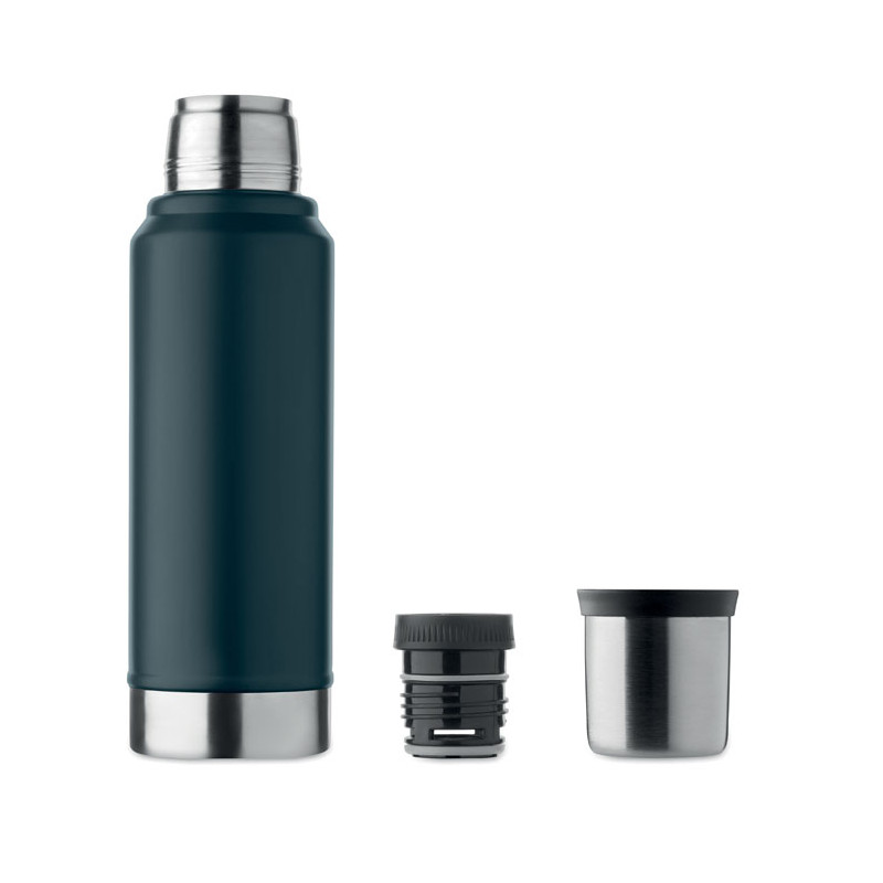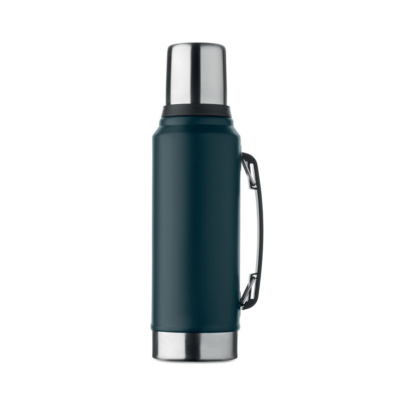 Double wall vacuum insulating bottle in recycled stainless steel (90% recycled stainless steel and 10% stainless steel) with handle on side. With PP lid and recycled stainless steel cup. Leak-free. Capacity: 1L.