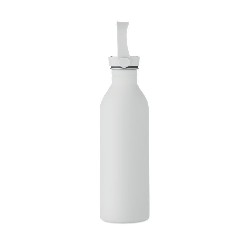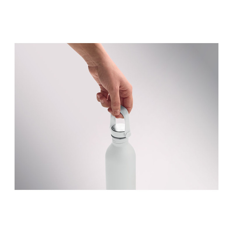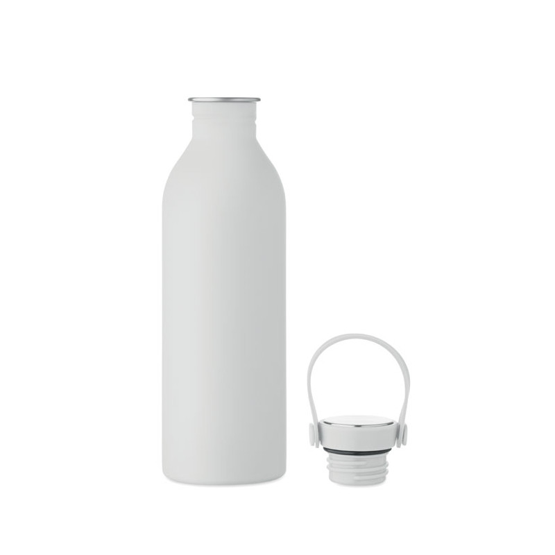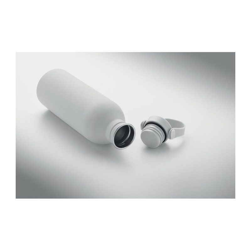 Single wall bottle made of 90 % recycled stainless steel and 10% stainless steel with rubber finish. Includes PP and SS lid with silicone handle. Capacity: 500 ml.