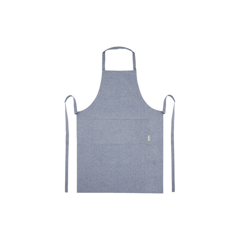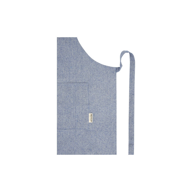Apron made of 200 g/m² recycled cotton polyester blend. Features 2 adjacent pockets with a combined size of 45 x 20 cm, and a 1 metre tie back closure. Recycled cotton is manufactured from pre-consumer waste generated by textile factories during the cutting process. Due to the nature of recycled cotton, there may be a very slight colour variation. This feature distinctly adds to a more authentic appearance. Length of the neck strap: 55 cm.