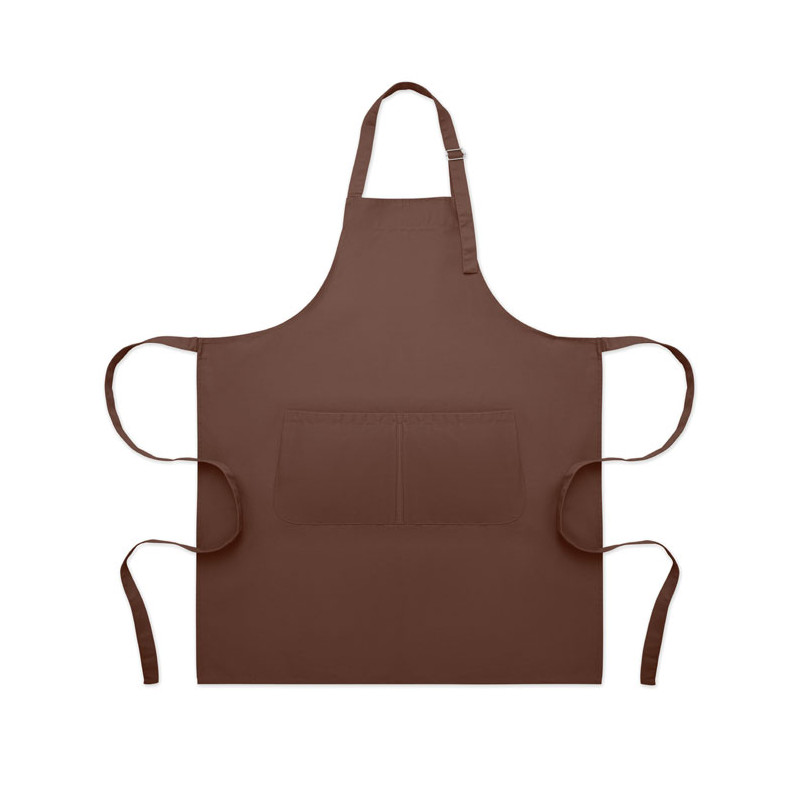 Long adjustable kitchen apron in 240 gr/m² polycotton (35% cotton, 65% polyester) with two front pockets and adjustable strap with metal buckle.