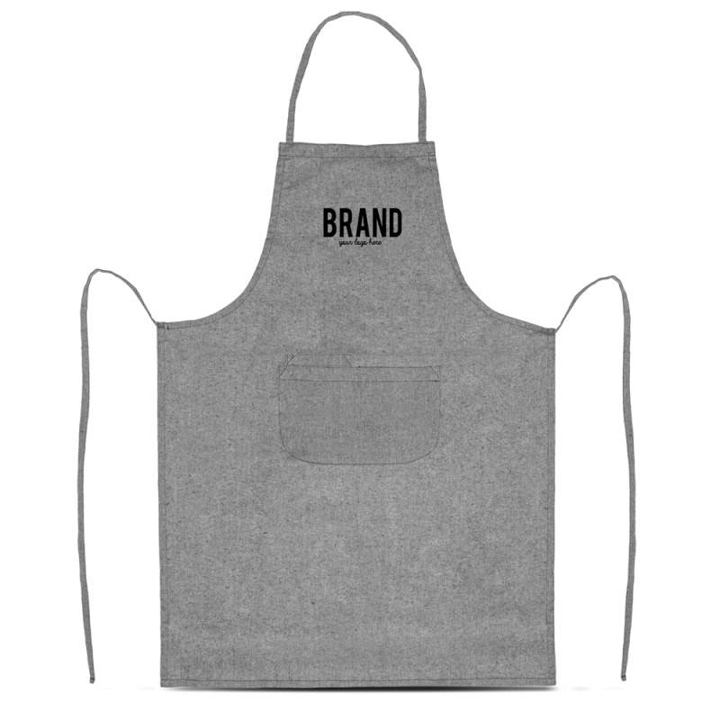 Custom eco-friendly recycled cotton aprons with a large central pocket. Comfortable and practical, they are the ideal gift for your clients and teams in events or catering.