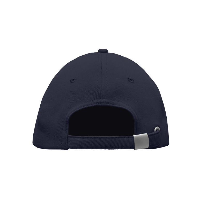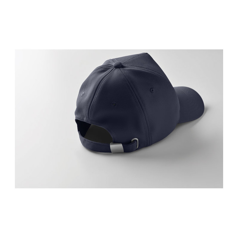 RPET 5 panel baseball cap in polyester 210 gm/m2 with silver steel buckle. 4 embroidered eyelets in matching colour. Size 7 1/4.