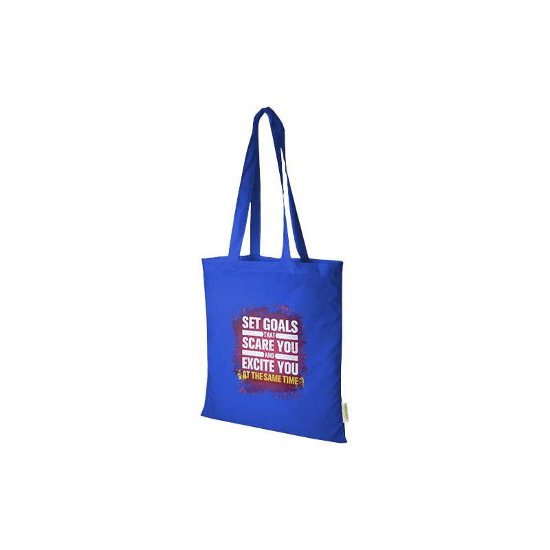 Custom organic cotton bags (140 g/m²) with long handles. A comfortable and sustainable promotional gift to impress your clients at any event.