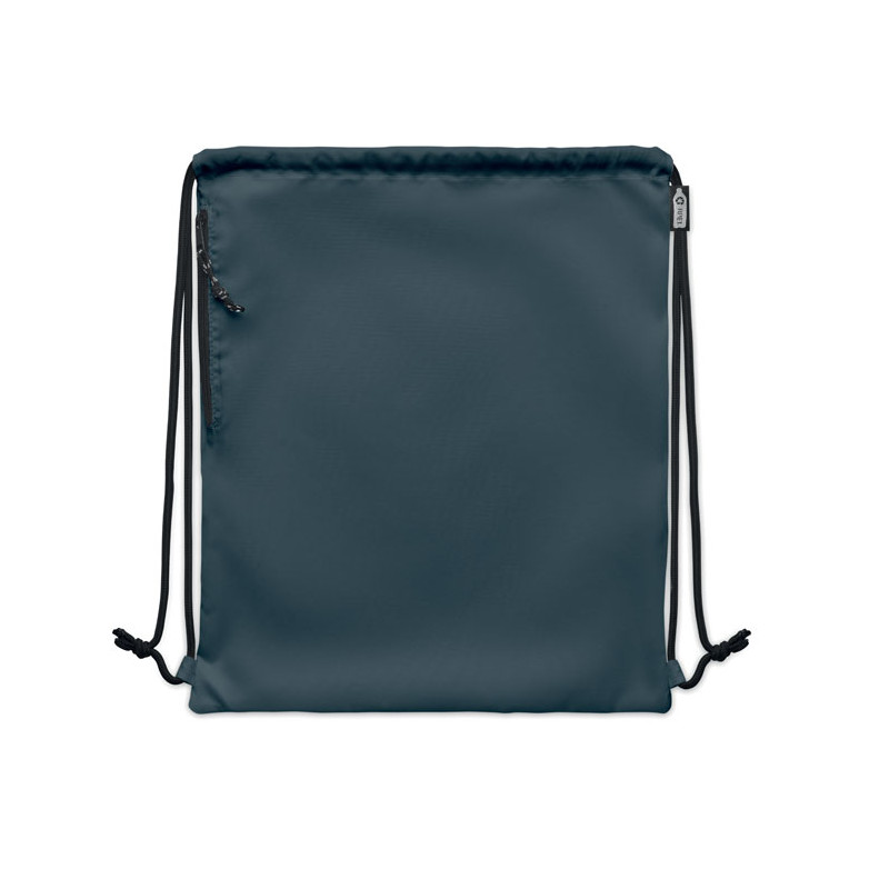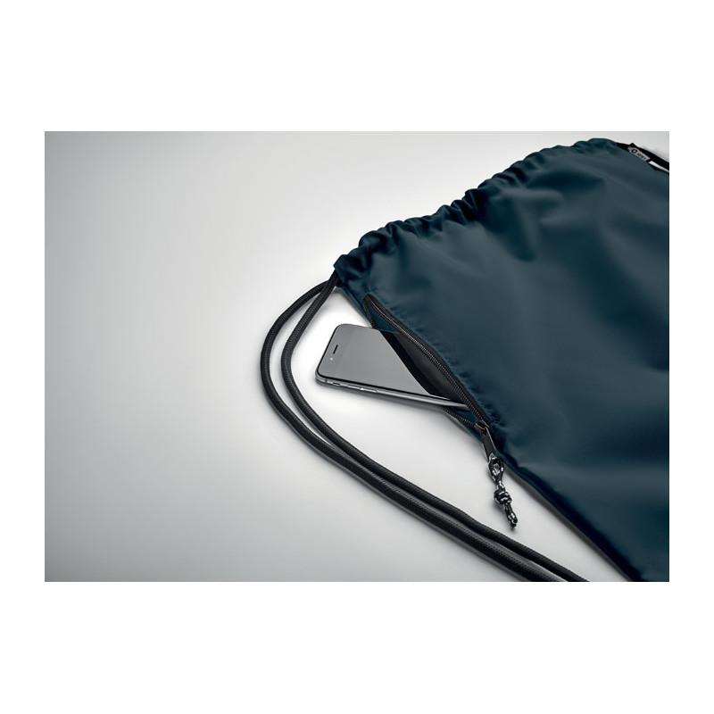 Large drawstring bag in 300D RPET polyester with side zippered outer pocket.