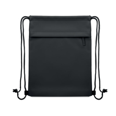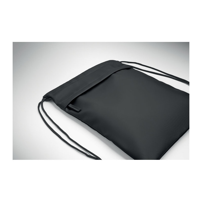 Drawstring bag with PU coated 600D RPET polyester and 190T RPET polyester lining. Zippered front pocket.