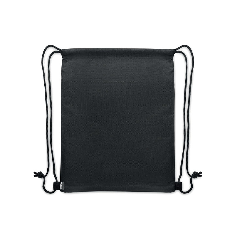 Drawstring bag with PU coated 600D RPET polyester and 190T RPET polyester lining. Zippered front pocket.