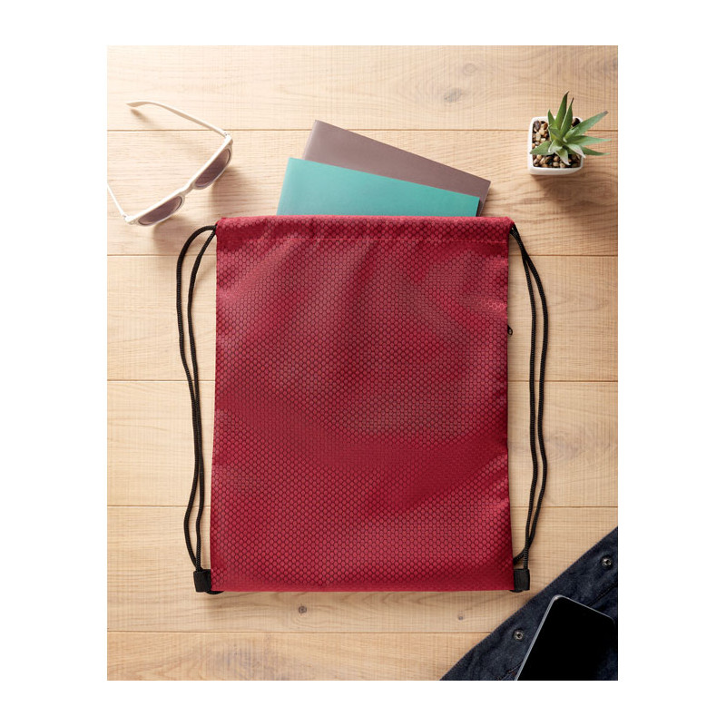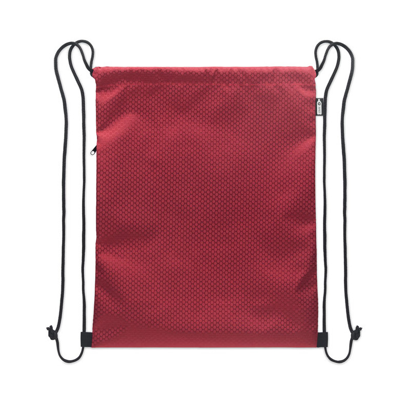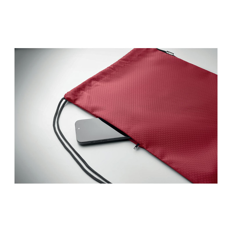 Drawstring bag in 420D RPET polyester with vertical side zip pocket and RPET 210D lining. Features durable cords on both sides. Capacity 4.5L, max load 5 kg.