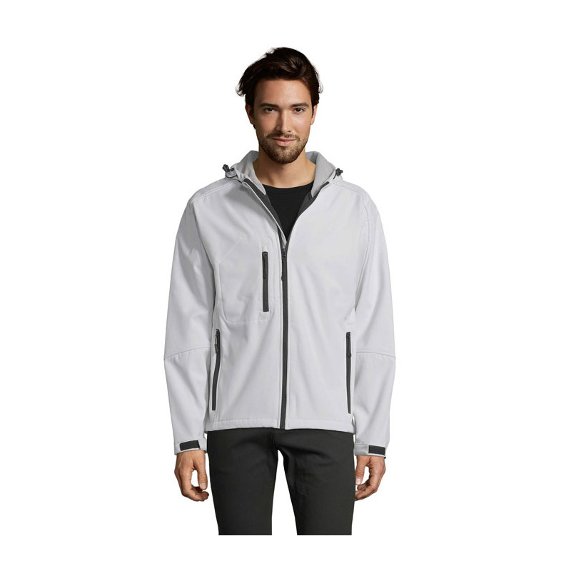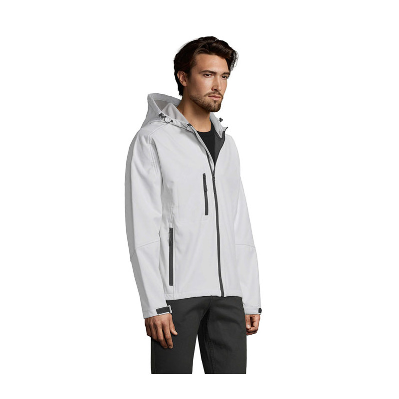 SOL'S REPLAY men's softshell jacket 340g. 2 side pockets with zipper - 1 front pocket with zipper. Adjustable drawstring at the waist. Adjustable cuffs with Velcro® strap. Hood with drawstring. Fabric details: 94% polyester - 6% elastane. 100% polyester fleece lining. 3 layers. Waterproof membrane 8000mm + Breathable. OEKO-TEX® certified. Only Sold with Print."