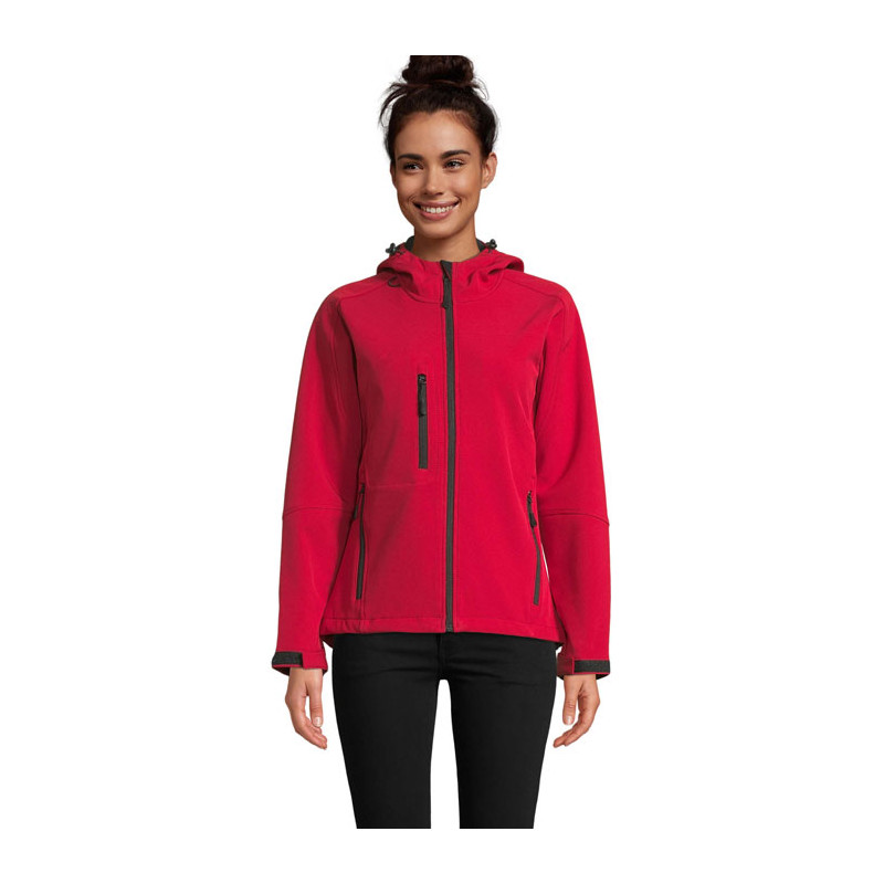 SOL'S REPLAY WOMEN, women's hooded softshell, 94% polyester - 6% elastane, fleece lining: 100% polyester, 3 layers, 8000 mm waterproof and breathable membrane softshell 340, 2 zipped side pockets and 1 zipped chest pocket, adjustable waist drawstring, adjustable cuffs with self-gripping fastener, hood with drawstring. About sizes matching, please refer to the size chart in the product documentation section.