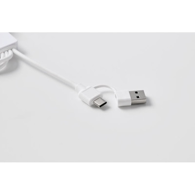 Key ring with charging cable with input: 2-in-1 type-C & type-A. Output: Watch charging (Samsung® and Apple®), 2 x type-C and micro-B (2 in 1 pin). Cable made of recycled TPE.