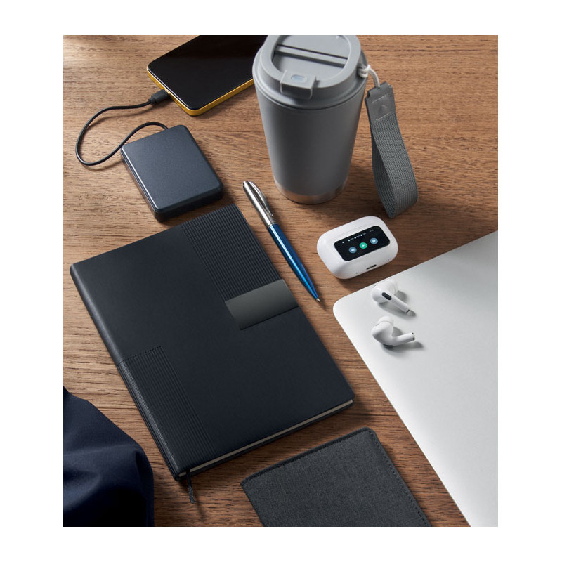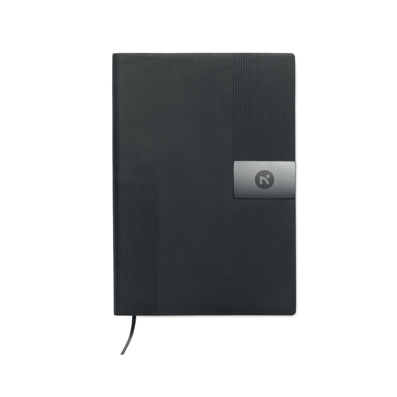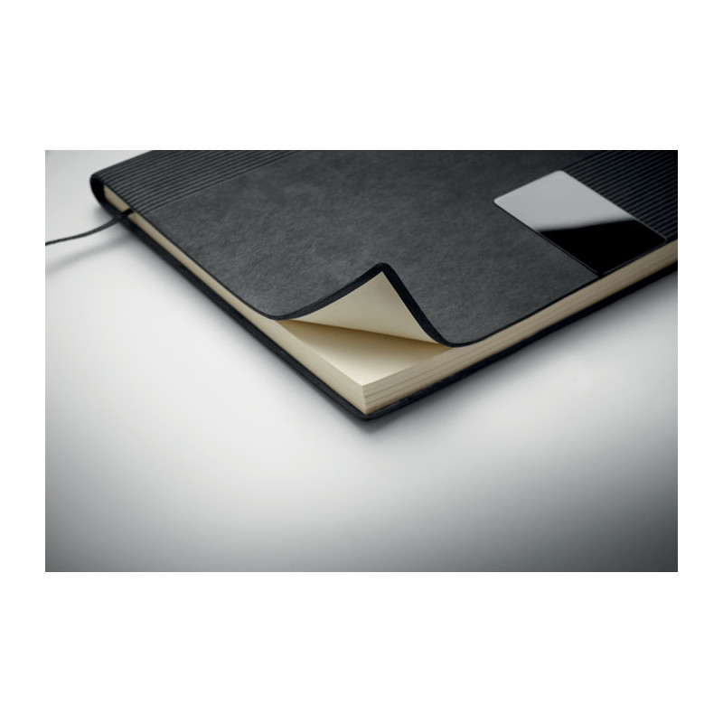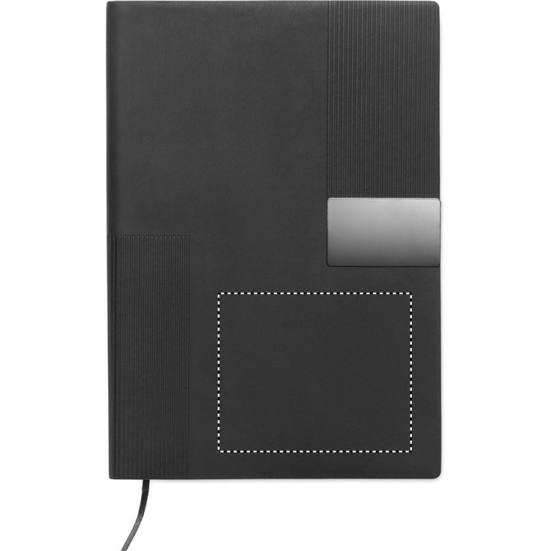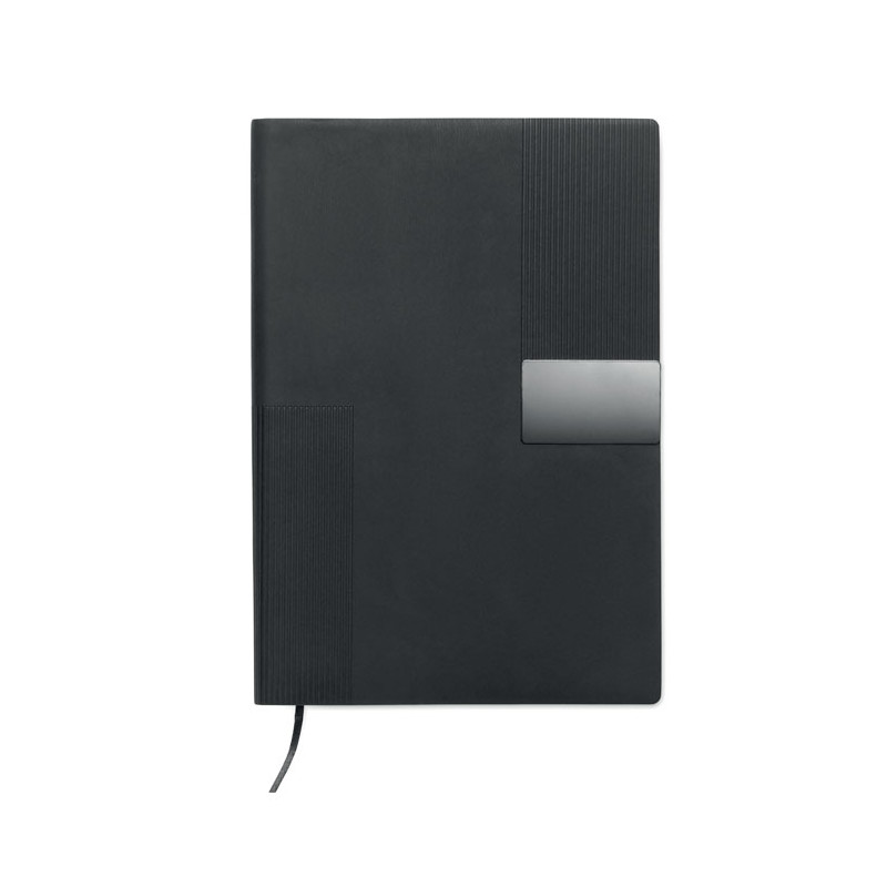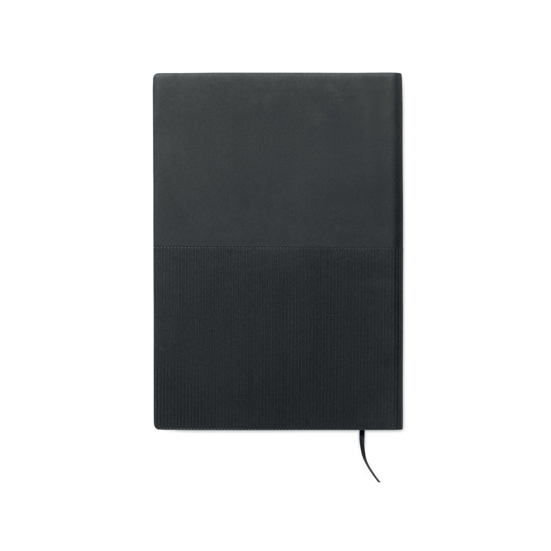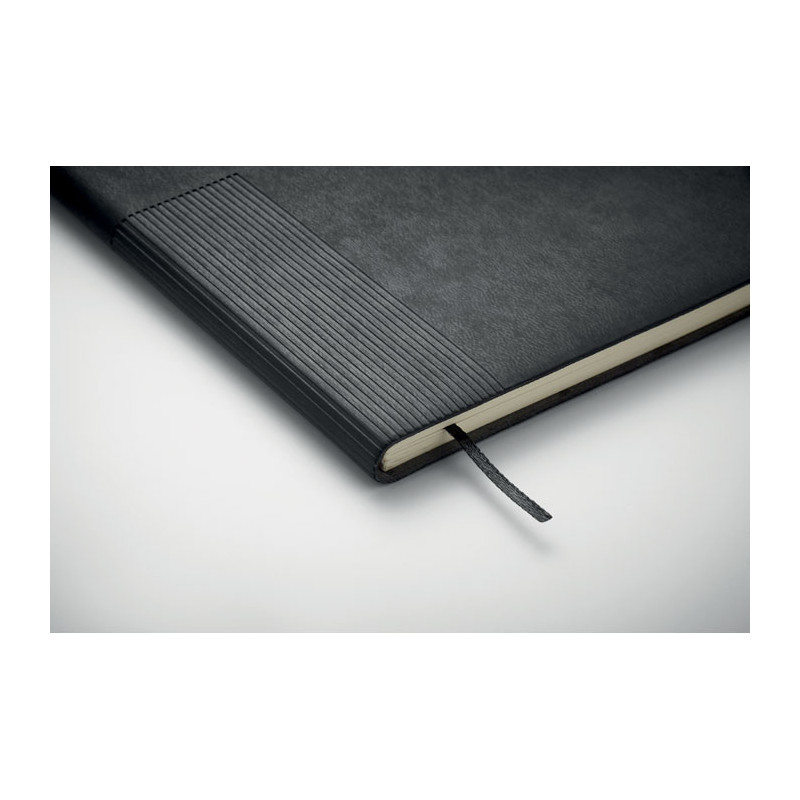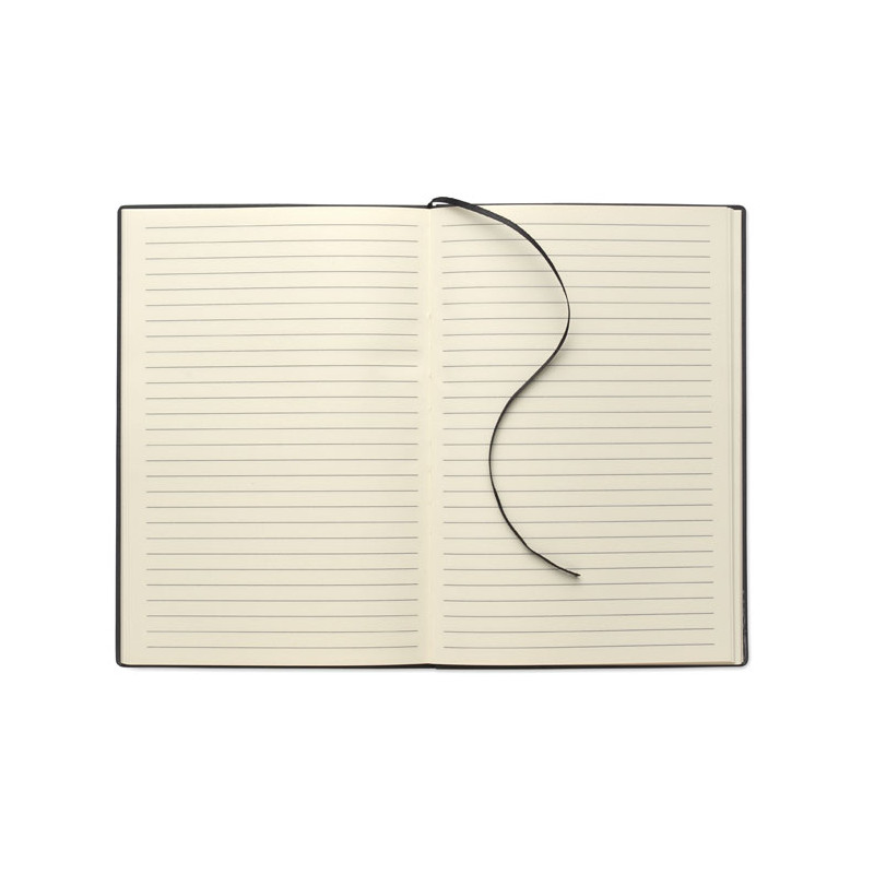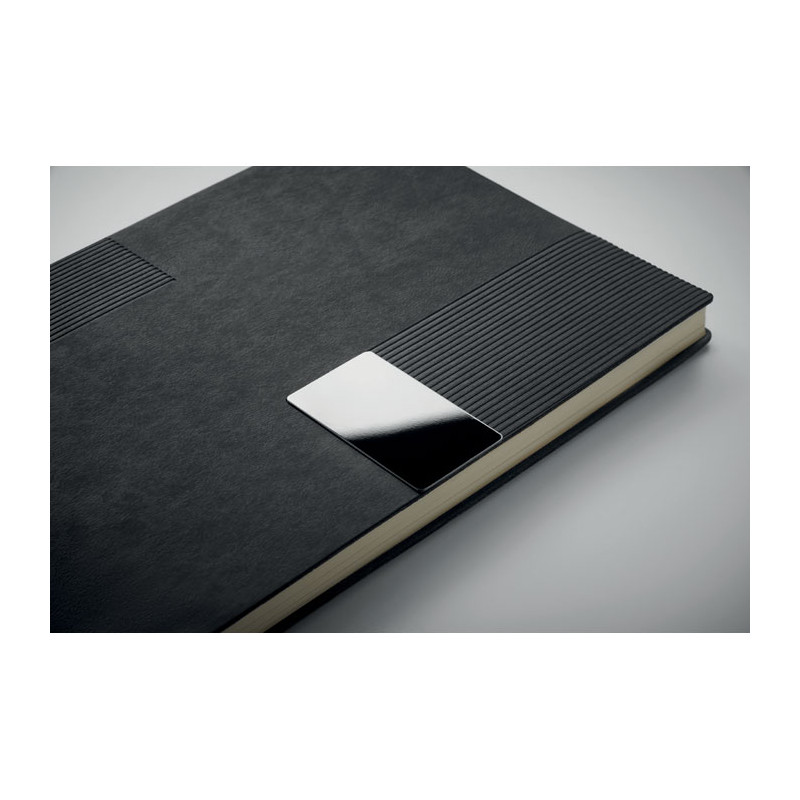 A5 PU notebook with soft cover. Casebound. 160 lined recycled paper pages (80 sheets). Matching elastic band and ribbon bookmark. Metal detail on the front.
