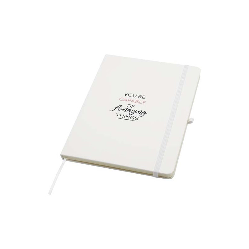 The Spectrum Plus A5 hard cover notebook with rounded corners is not only an office essential but also a great opportunity to promote your brand. The cardboard notebook has a soft-feel cover and 80 lined cream coloured sheets of 70 g/m², ideal for writing down quick ideas or long notes. The notebook has a pen loop, elastic closure, ribbon marker and accordion pocket.