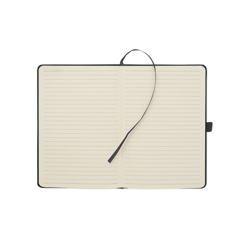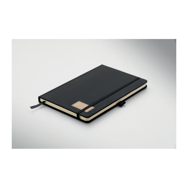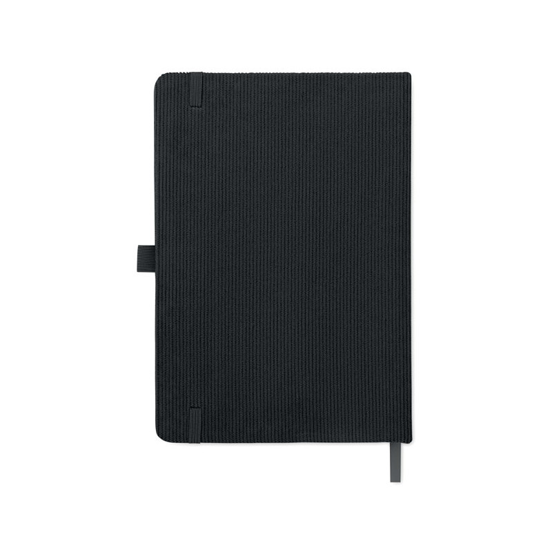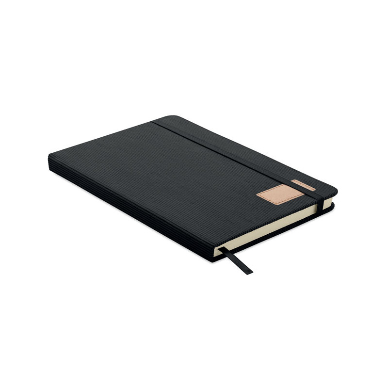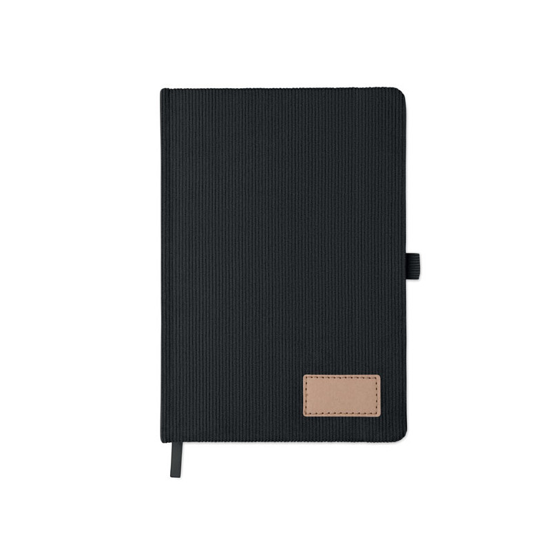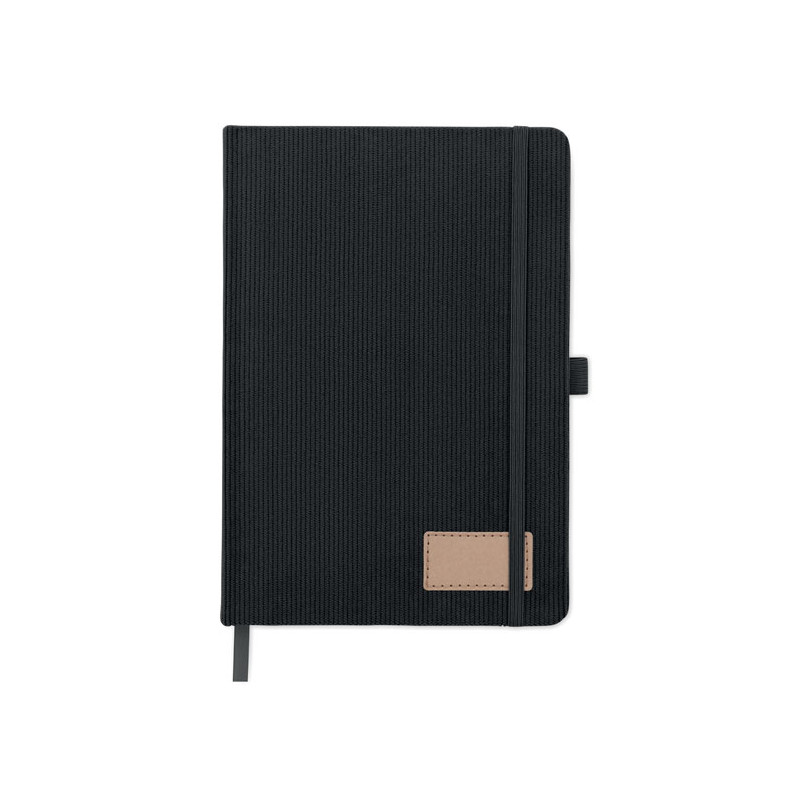 A5 notebook with hard RPET polyester corduroy cover and 192 lined recycled paper pages (70 gr/m2). Casebound design with elastic band closure, pen loop, ribbon page marker, and washed kraft paper tag.