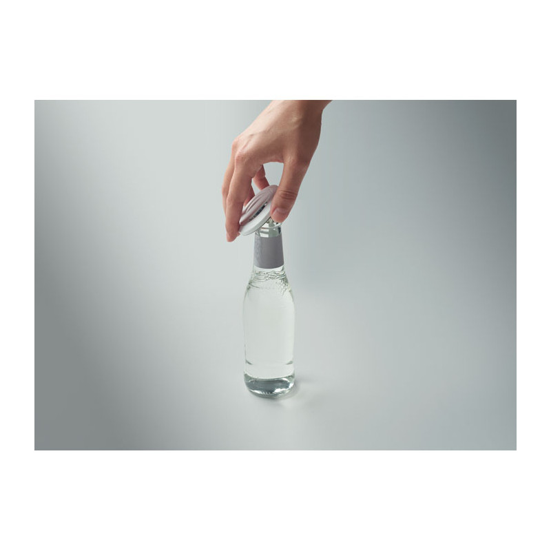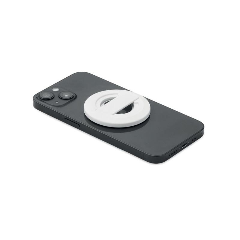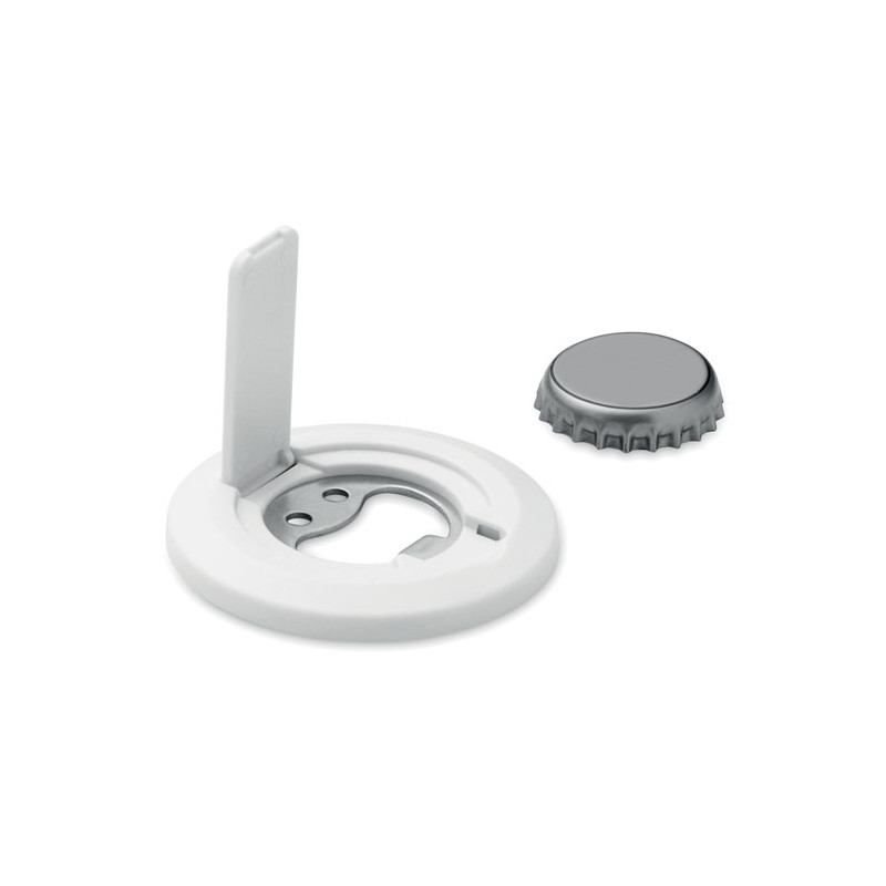Magnetic phone holder and stand with bottle opener. Compatible with iPhone® 12 and newer. Including additional magnetic metal ring to support charging of other non-magnetic wireless chargeable phones.