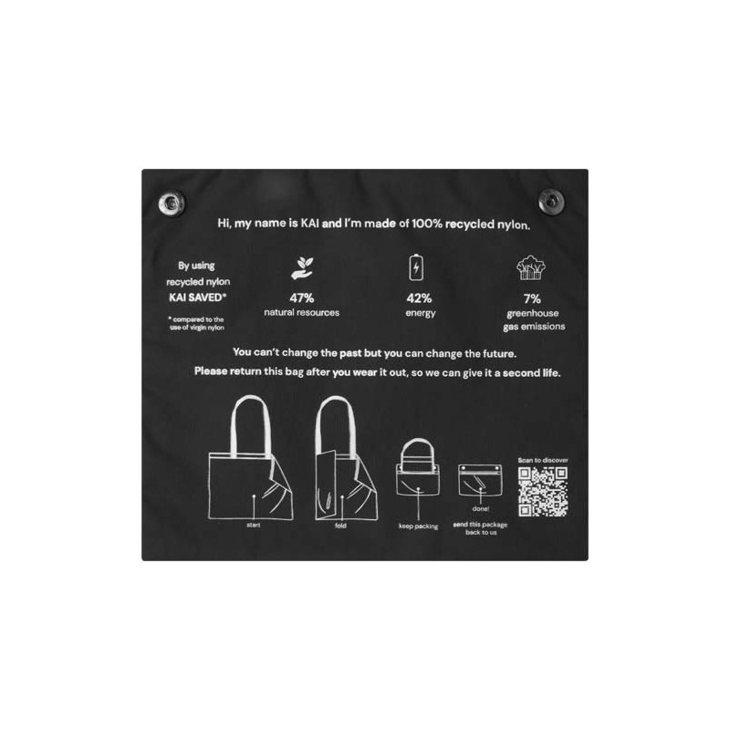 The Kai GRS recycled circular tote bag – the biggest positive impact maker in terms of environmental performance. More sustainable exploration starts with better design – a design with less impact on the environment. The total average reduction in impact already made with 1 bag is as follows: 7% carbon footprint, 42% energy and 47% eco costs. Made from 200T GRS certified recycled nylon, the Kai is a classic and timeless tote bag that is suitable to use on a daily basis. The designated spot for printing is on the pocket that doubles as pouch. The bag can be returned via a take-back program featuring a QR code that provides additional information.