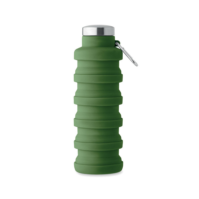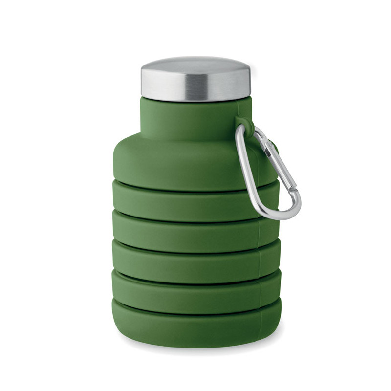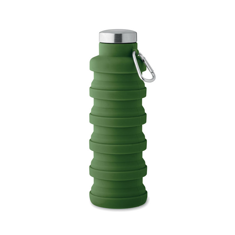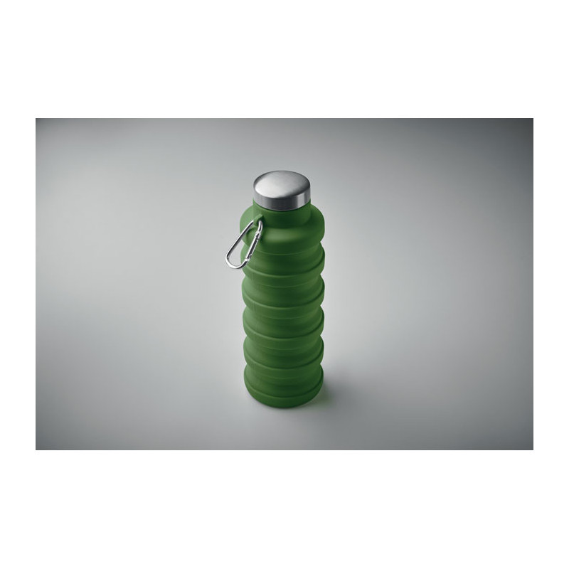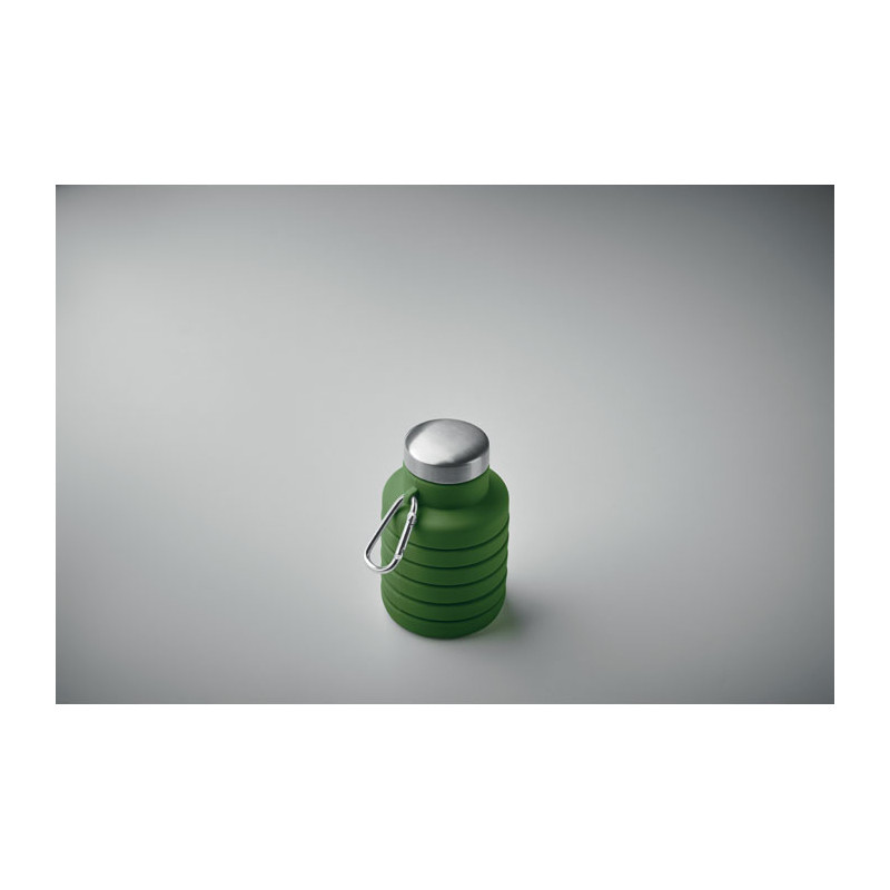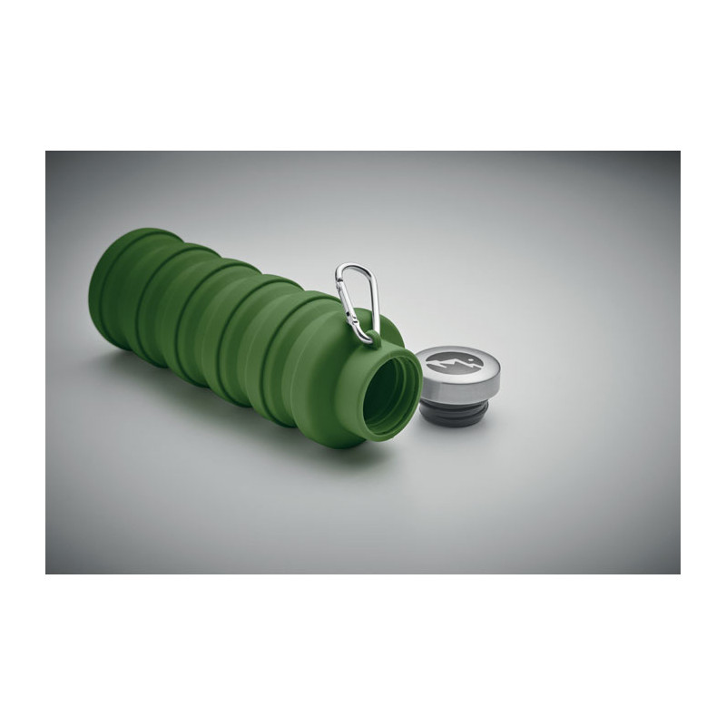 Collapsible silicone bottle with stainless steel lid and aluminium carabiner. The carabiner is not for climbing (non-professional use). Capacity: 500 ml.