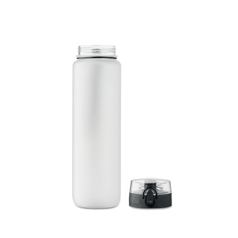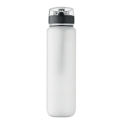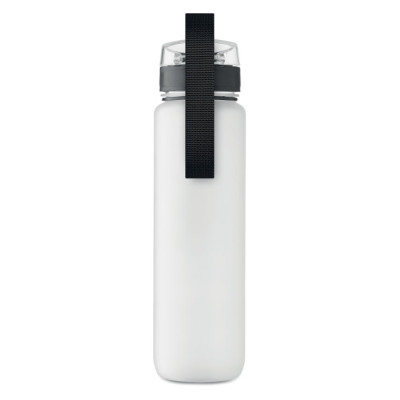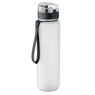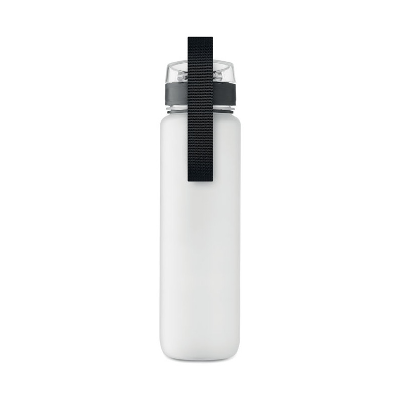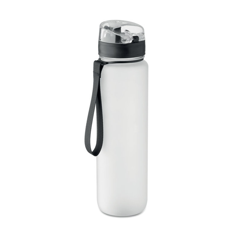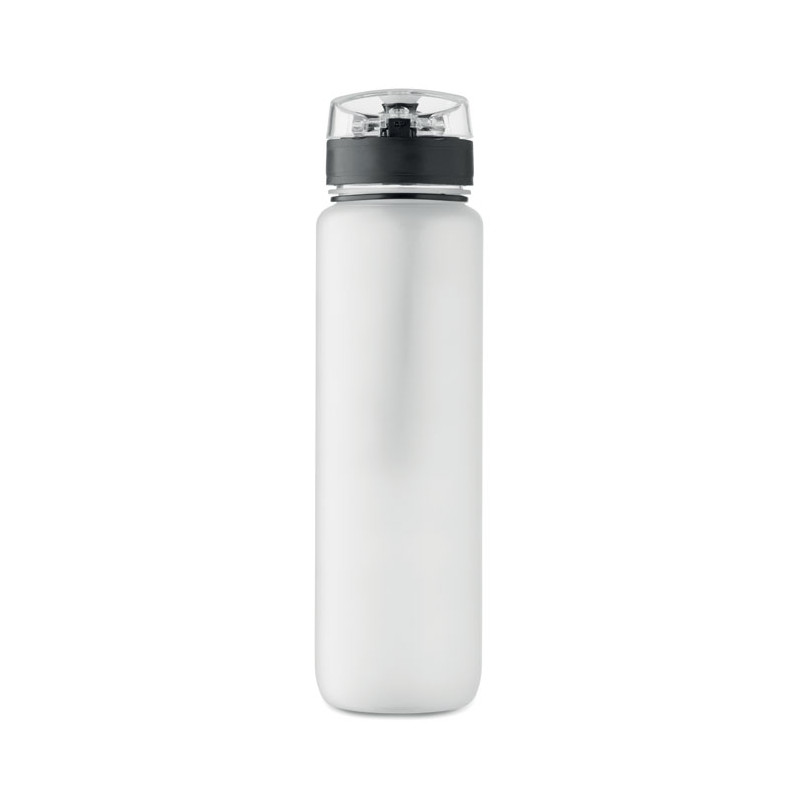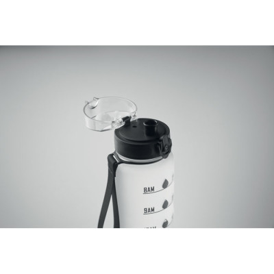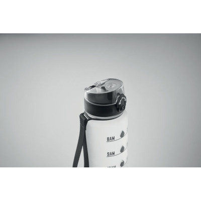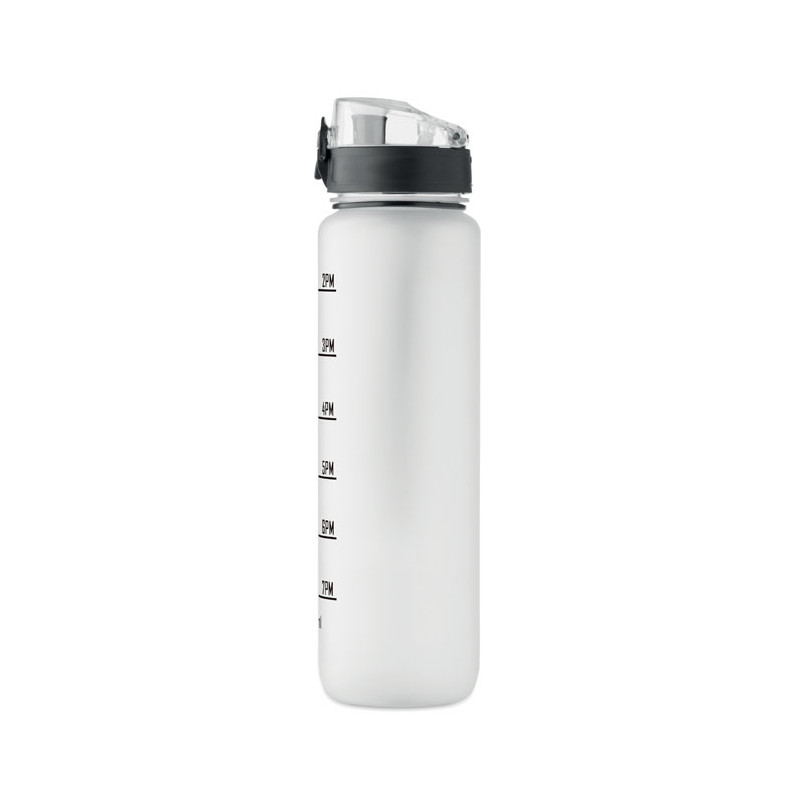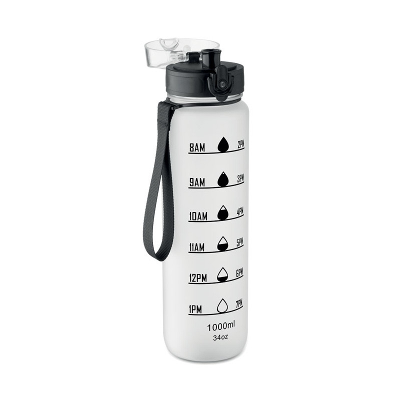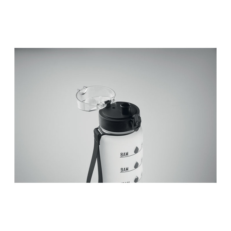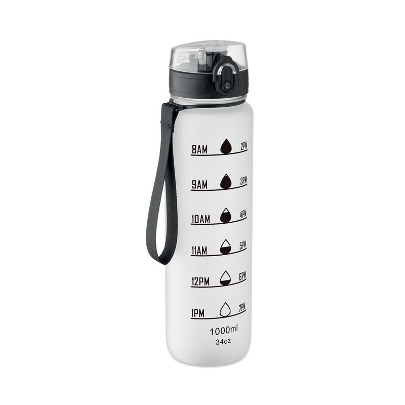 Sports water bottle in RPET, motivational time markings, one hand opening flip top lid, safety lock and carrying strap. Leak-free. Capacity: 1L.