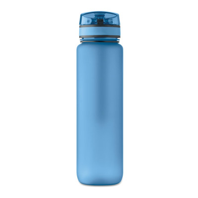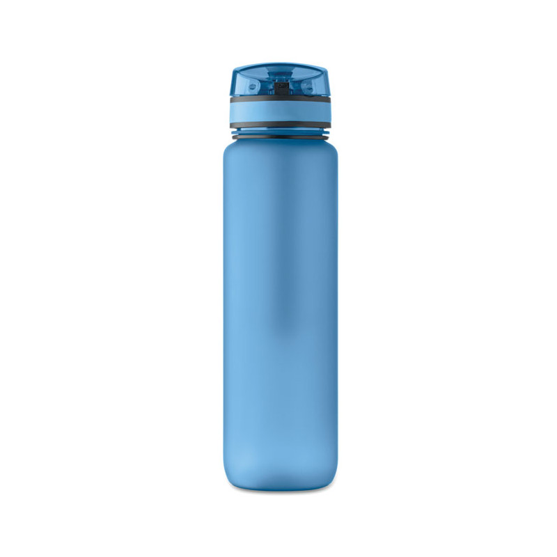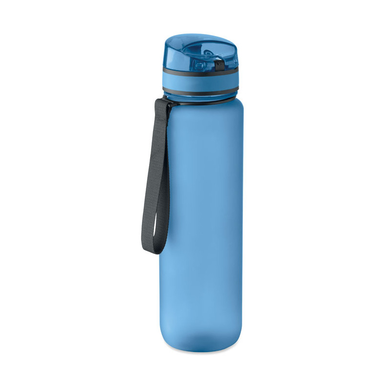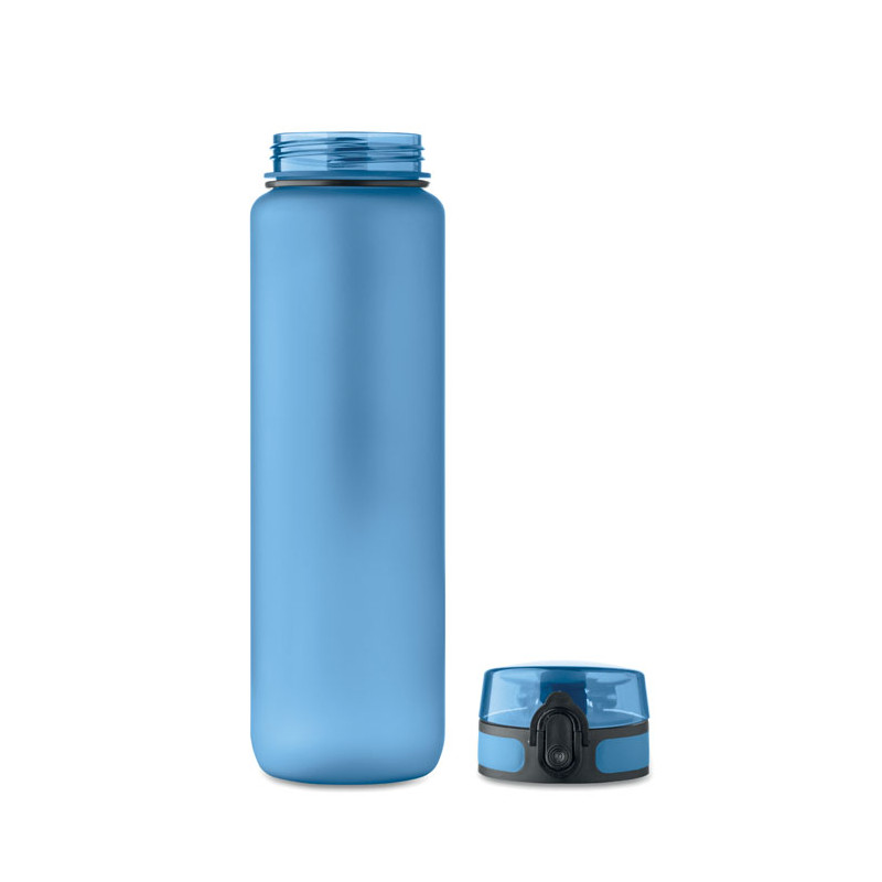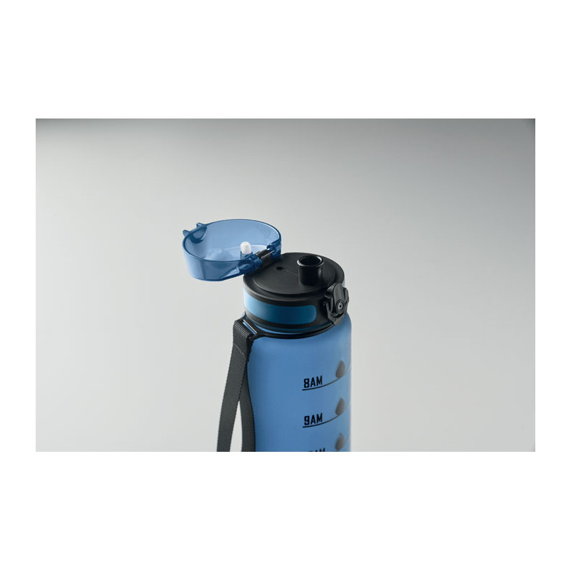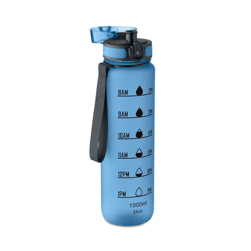 Sports water bottle in RPET, motivational time markings, one hand opening flip top lid, safety lock and carrying strap. Leak-free. Capacity: 1L.