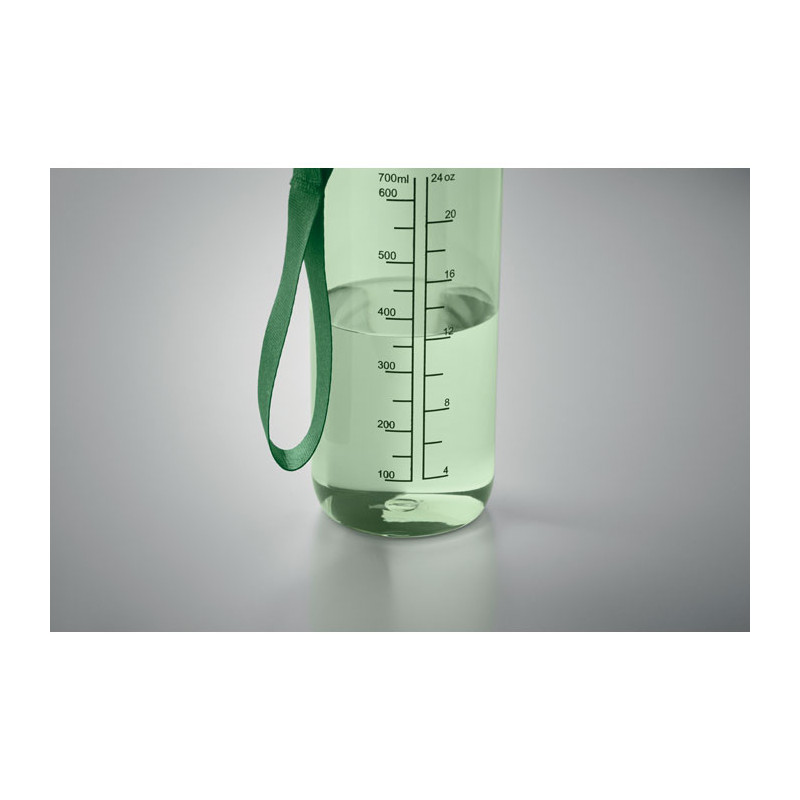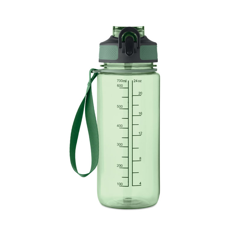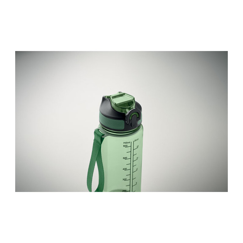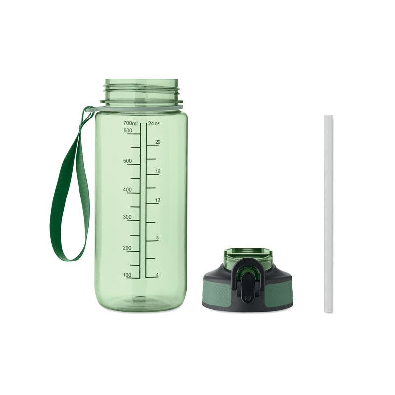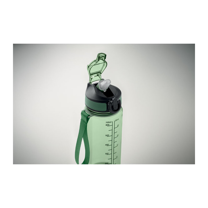 Motivational sports water bottle in RPET with integrated straw, soft silicone mouth piece, one hand opening flip top lid, safety lock. With carrying strap in RPET satin. Capacity 700 ml. Leak free.