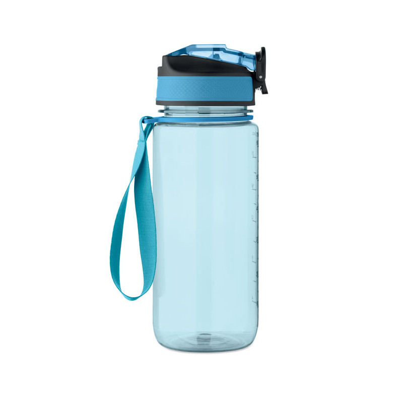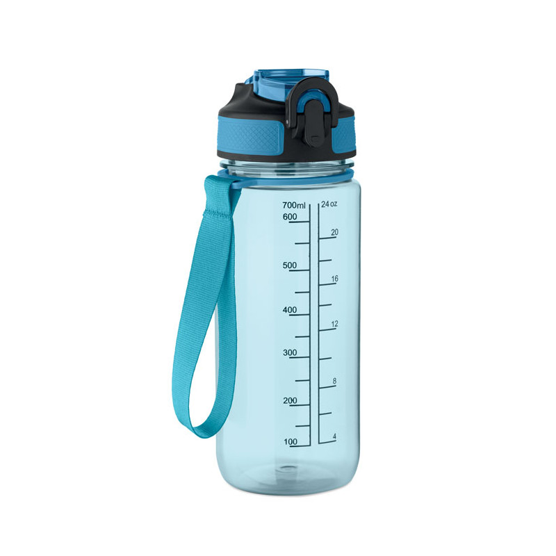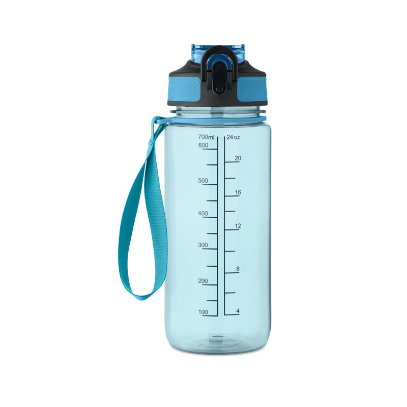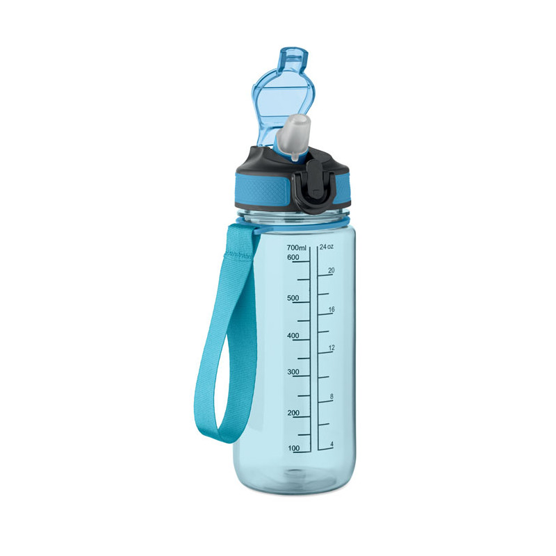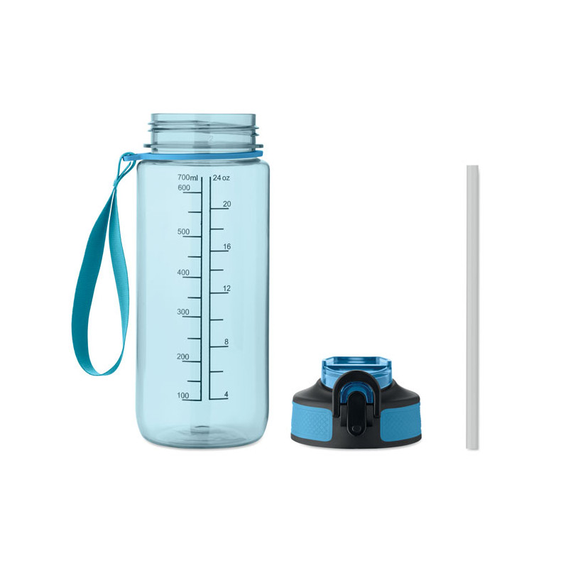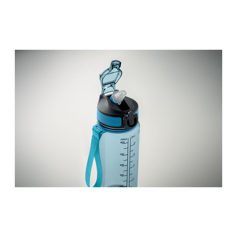 Motivational sports water bottle in RPET with integrated straw, soft silicone mouth piece, one hand opening flip top lid, safety lock. With carrying strap in RPET satin. Capacity 700 ml. Leak free.
