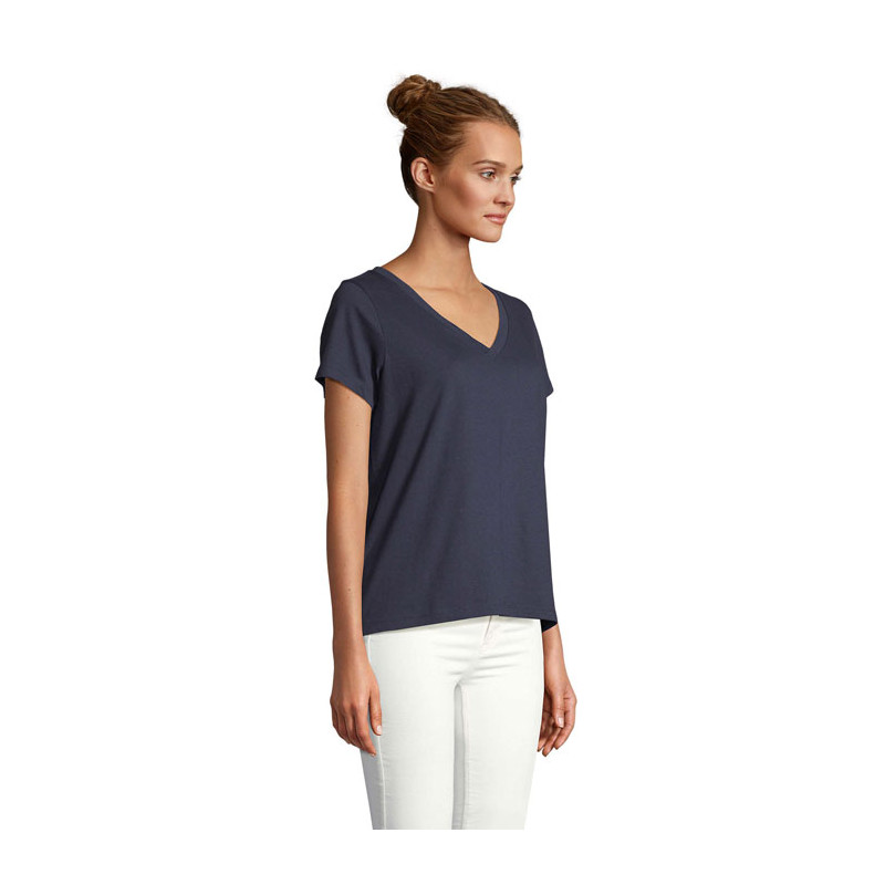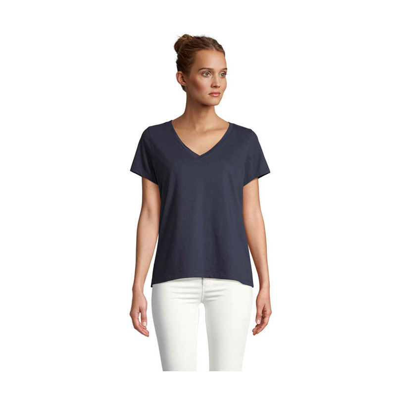 Women's V-neck cotton t-shirt. With a modern tubular cut, it is the perfect personalized promotional gift to ensure comfort and a modern style in uniforms or corporate events.