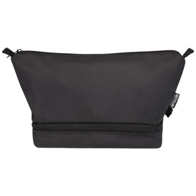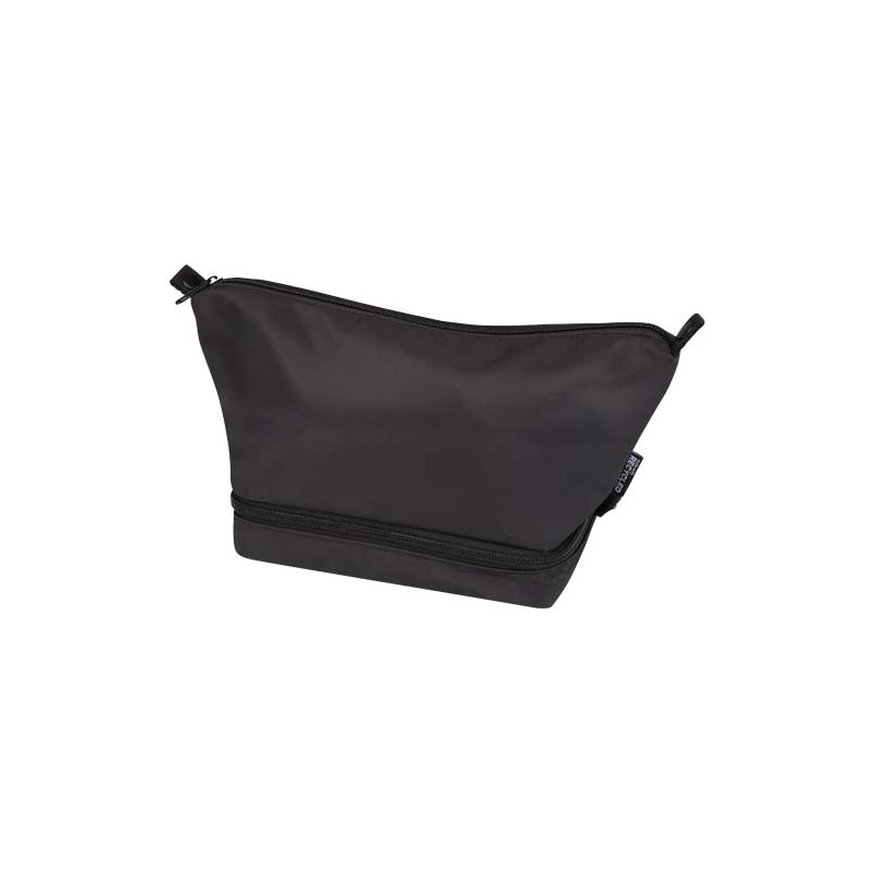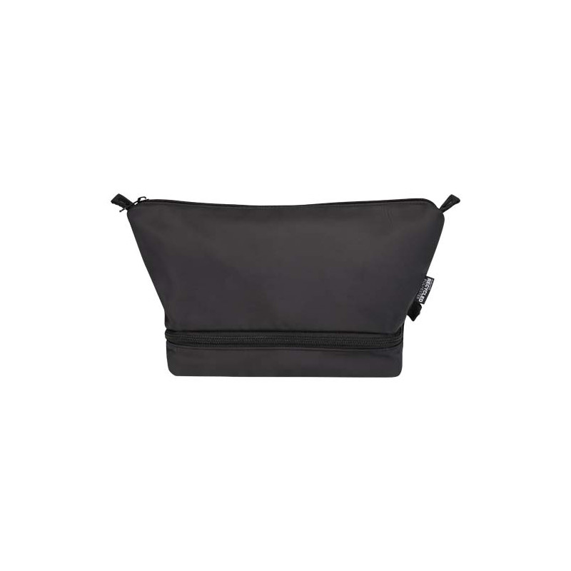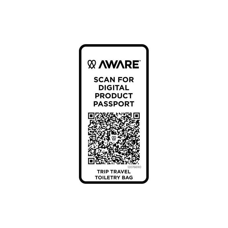 The Trip Aware™ recycled travel toiletry bag is a compact, structured bag designed to keep personal items neatly organised while travelling. Made from 290D twill polyester with a knitted backing and lined with RPET 210D/PU, it features a clean layout with practical compartments. The main compartment includes an internal zip pocket for smaller items, while the clamshell-style bottom compartment keeps essentials separate for easier access and improved organisation. Each bag also comes with an Aware™ tracer. This innovative feature allows users to trace the origins and journey of their item through a QR code, enhancing transparency in the supply chain and fostering a stronger connection between the product and its production process. Volume capacity: 6 litres.