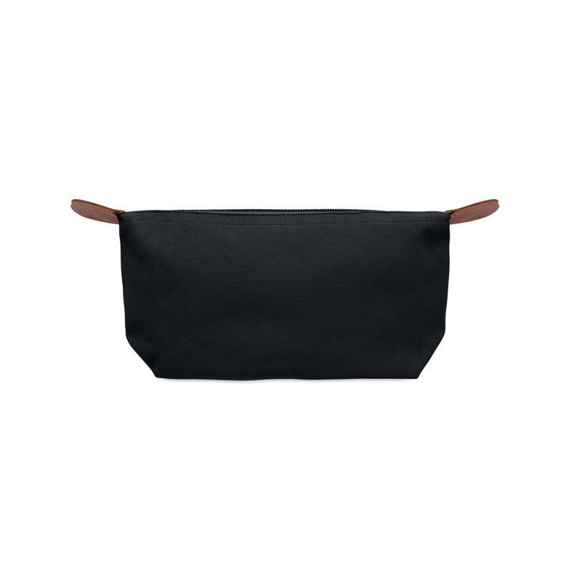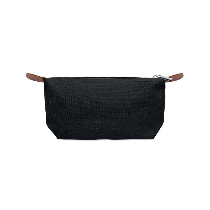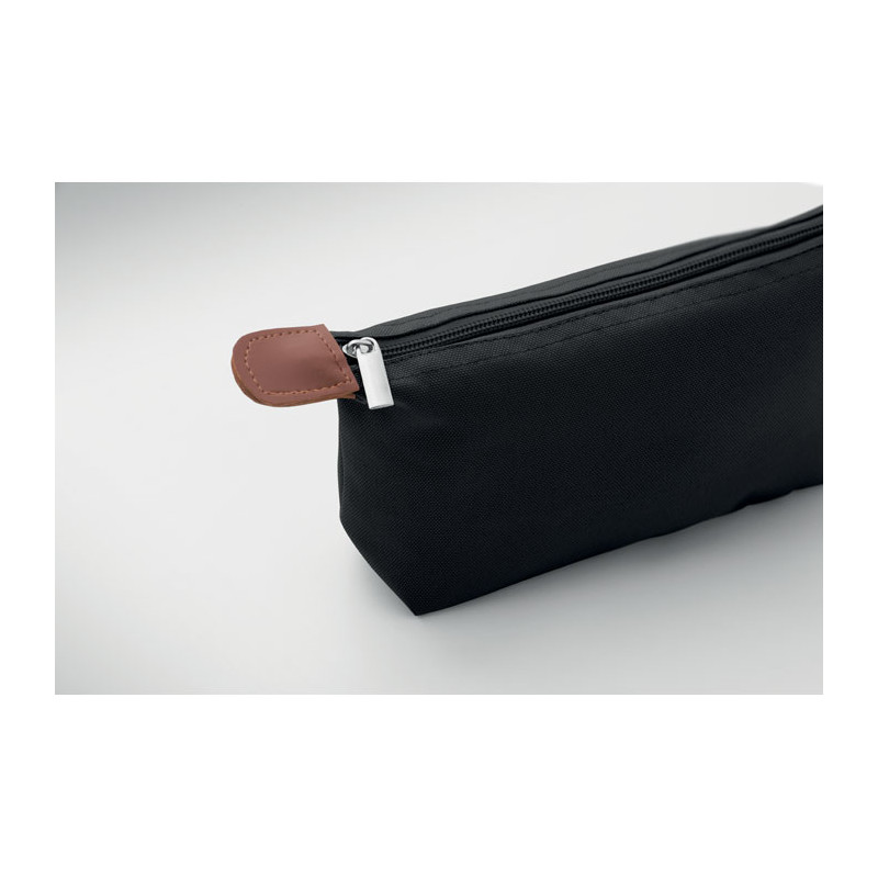 Cosmetic bag made of 600D RPET polyester with top zip closure and brown PU detail.