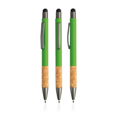 Aluminum and cork rubberised finishing stylus ball pen. With with elegant combination of materials, this ball pen is ideal for laser engraving, brings premium to design. With cork grip and stylus on the pulse button. Write in blue ink.