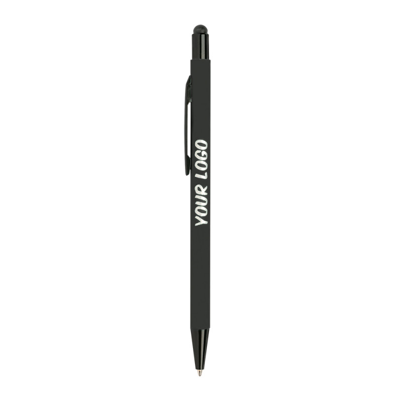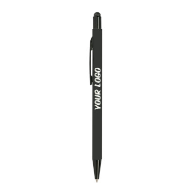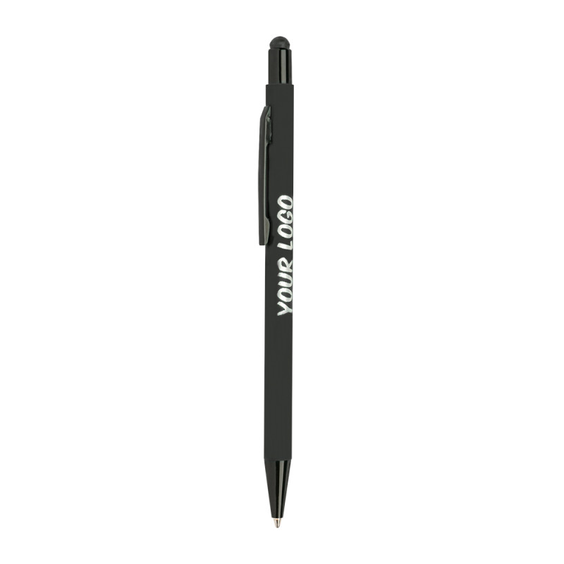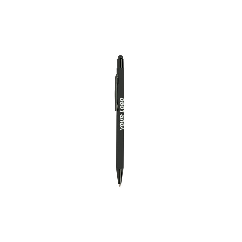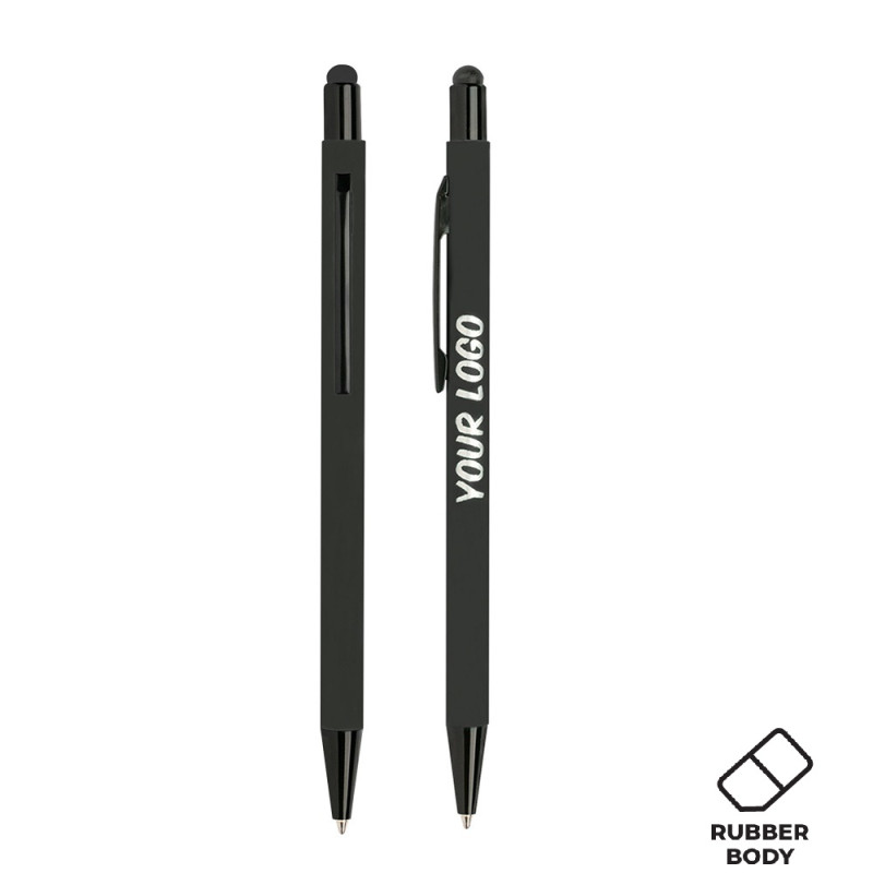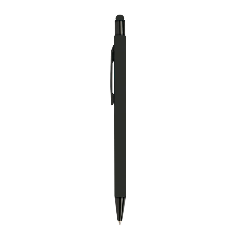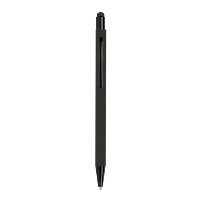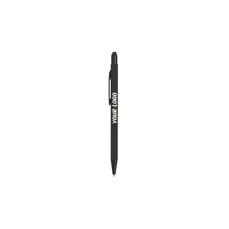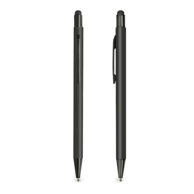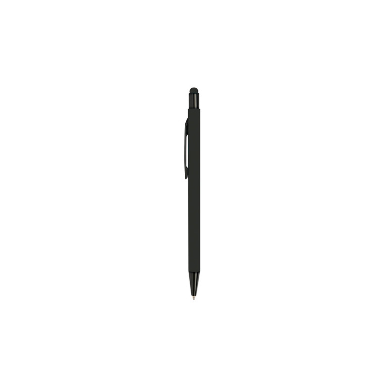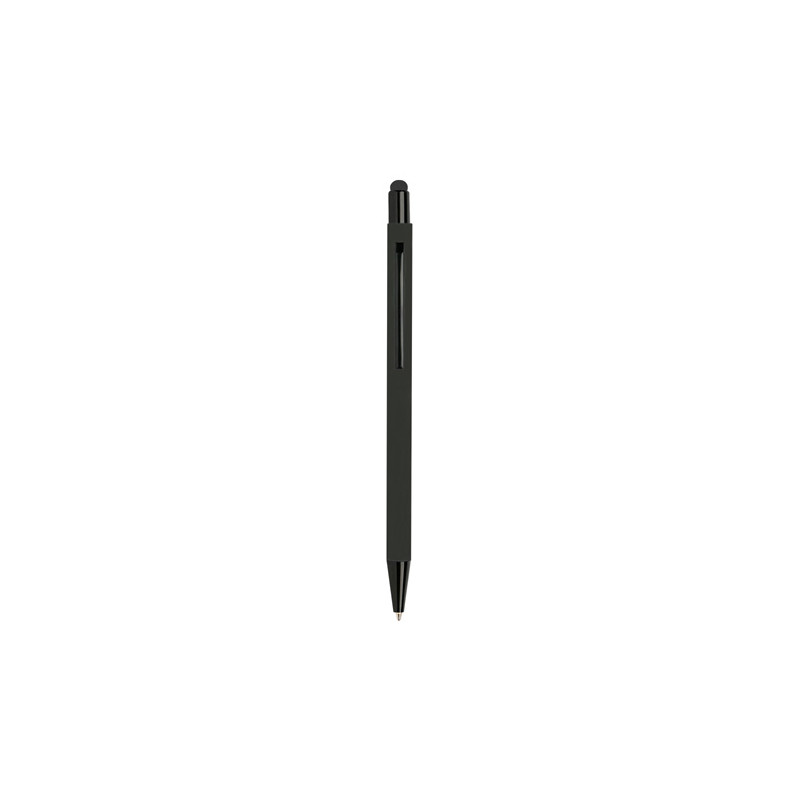 Ballpoint pen in aluminum, body with touch rubber. Blue writing, pulsar system. Slim-body ballpoint pen with a delicate touch. It has body color touch and black details. Customize and see your brand recognition pass from hand to hand.