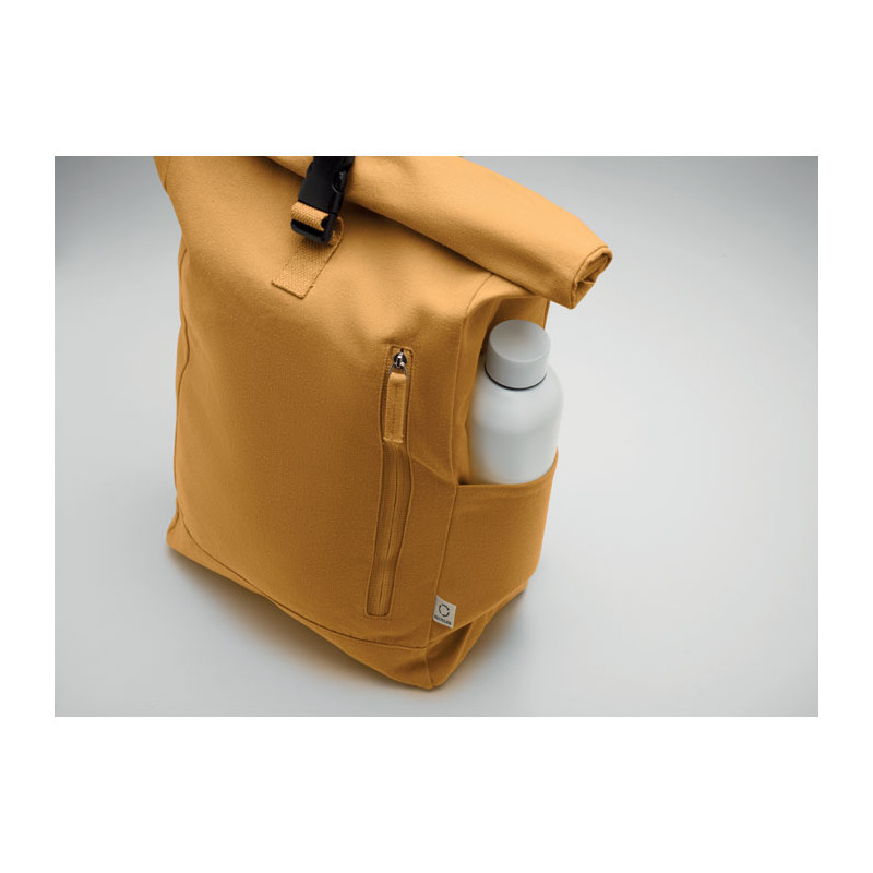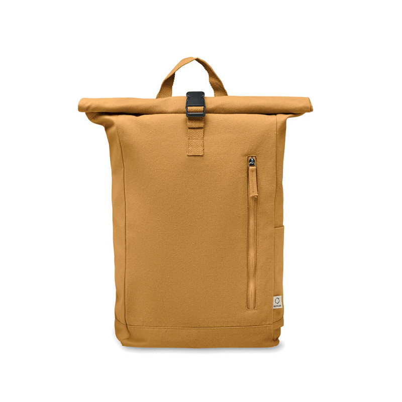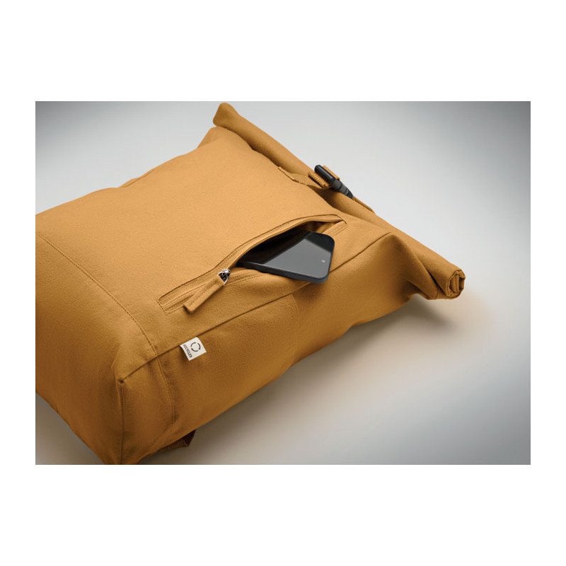 Roll top backpack with hook and loop closure in 390 gr/m² recycled cotton (80%) and recycled polyester (20%). Zippered front pocket.