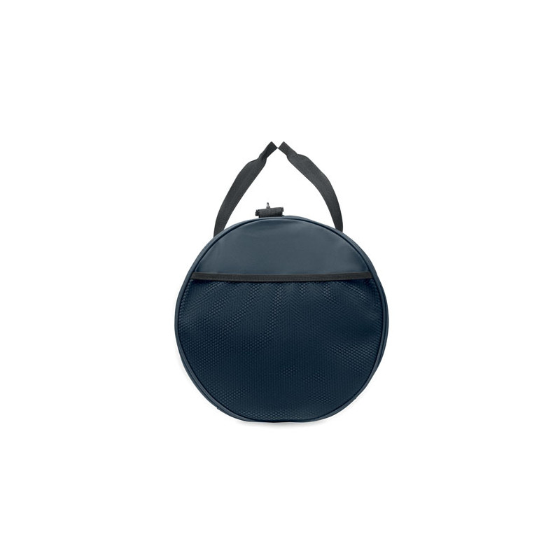 Duffle bag in 600D RPET polyester with PU coating. Front zippered pocket. Inside 210D RPET polyester lining. 1 side zippered compartment / 1 side mesh compartment. Zippered pocket inside.