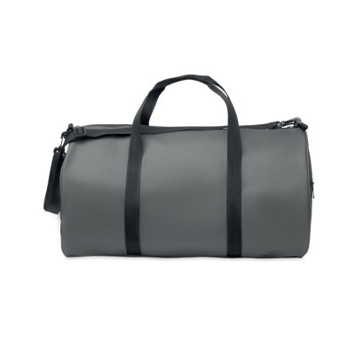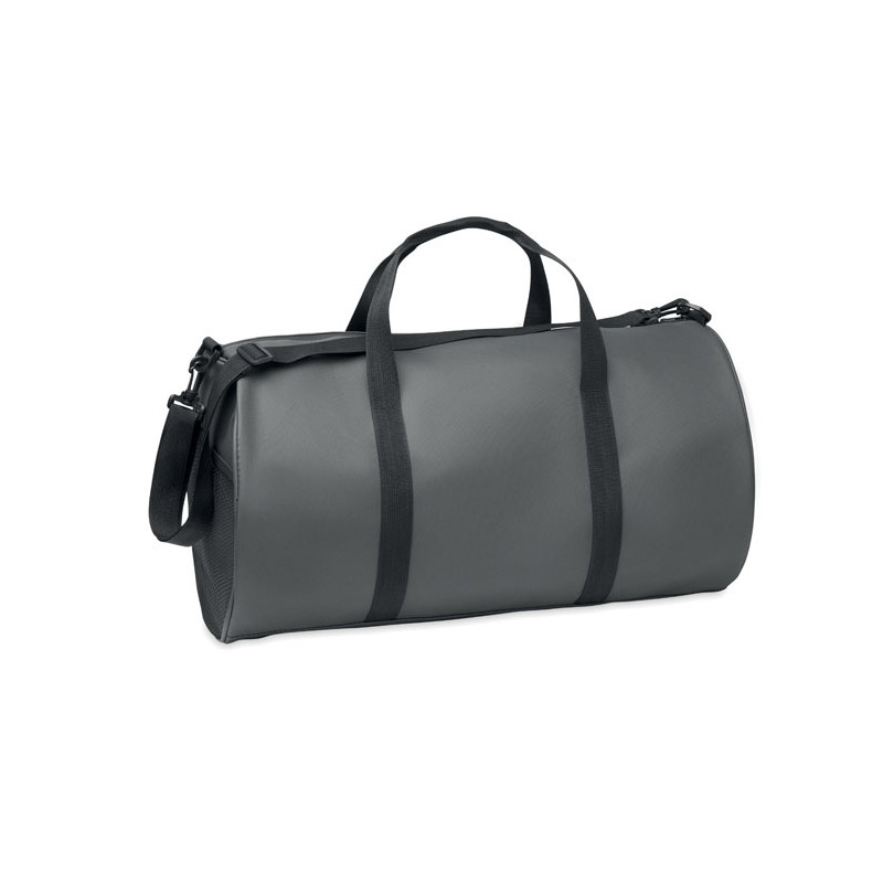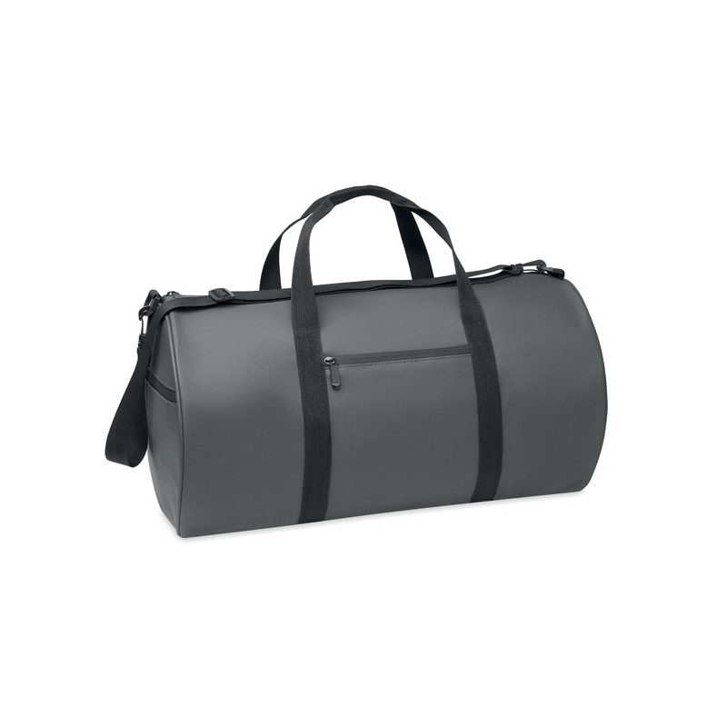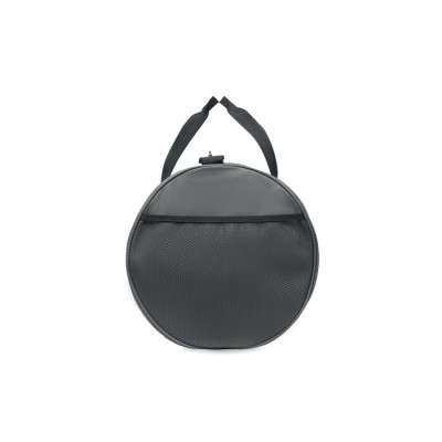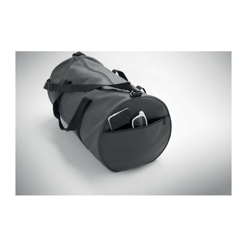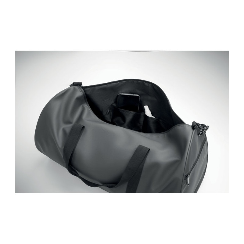 Duffle bag in 600D RPET polyester with PU coating. Front zippered pocket. Inside 210D RPET polyester lining. 1 side zippered compartment / 1 side mesh compartment. Zippered pocket inside.