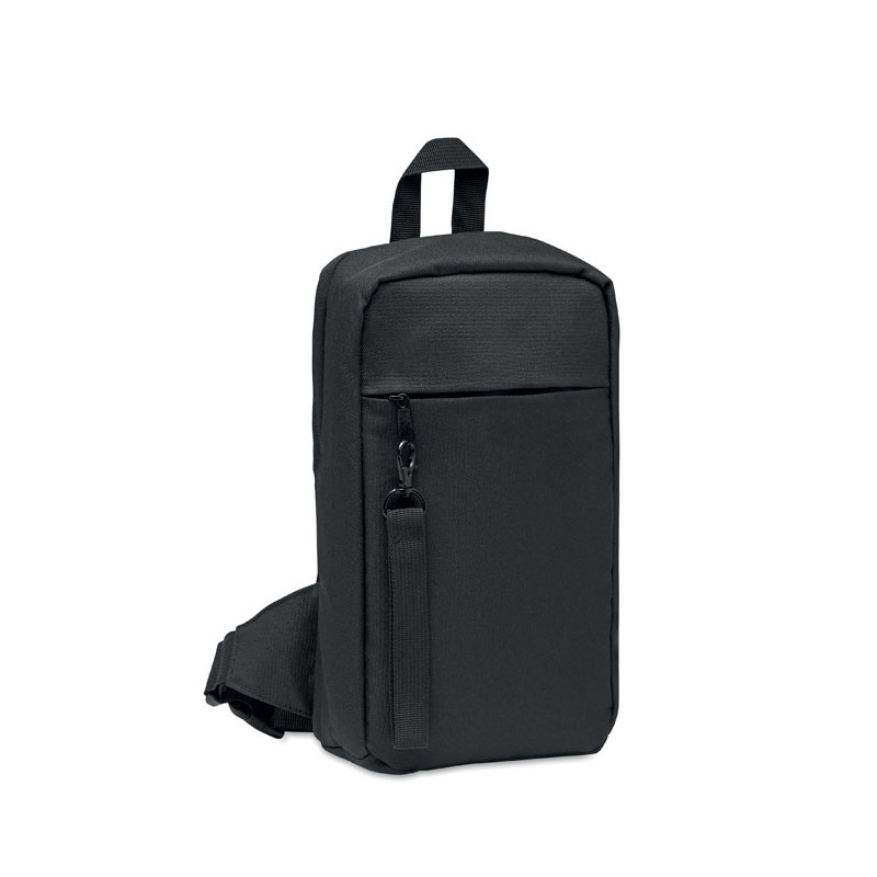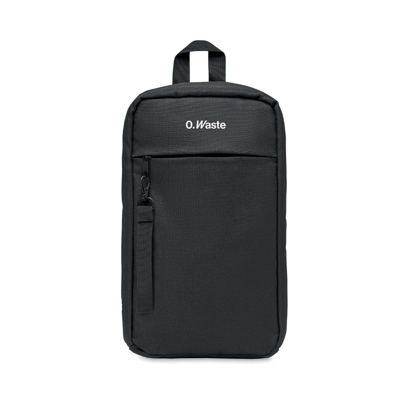 Cross body bag in 600D RPET polyester. Padded main compartment with RPET mesh pocket and zippered front pocket. Adjustable strap and separate handle.