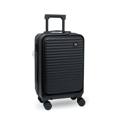 20 inch hard-shell trolley in ABS. 1 main compartment with inner compartment. Additional front zippered compartment for documents and padded 15'' laptop compartment. Includes a security lock (TSA). Rides on 4 wheels.