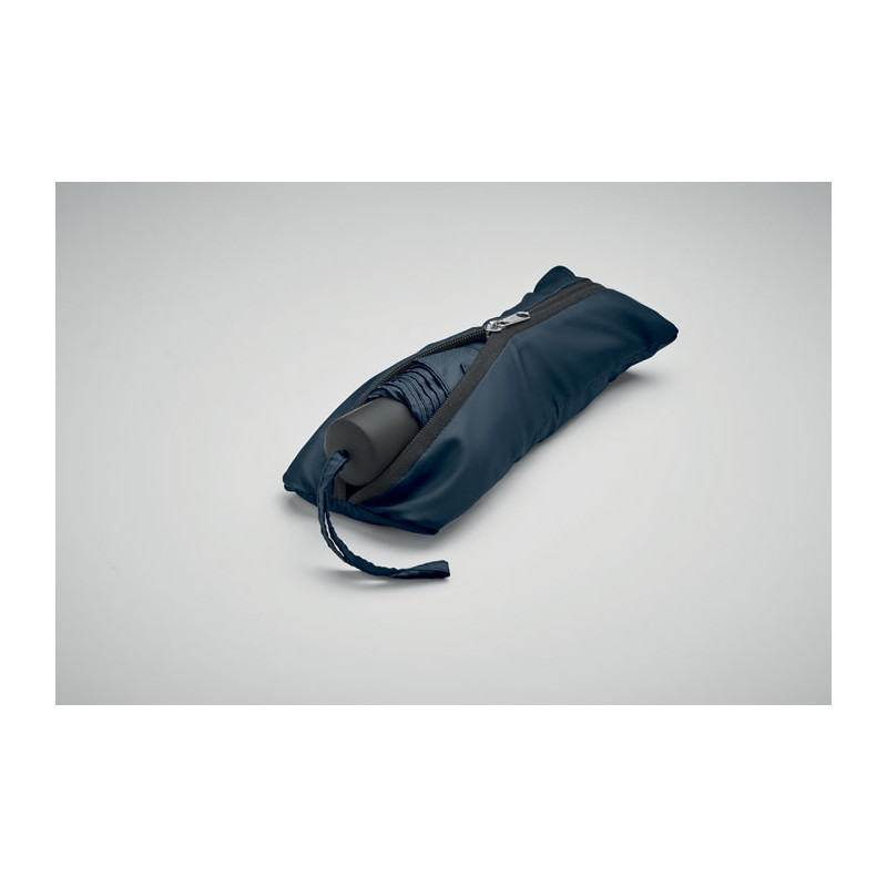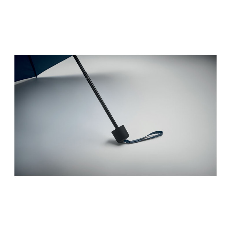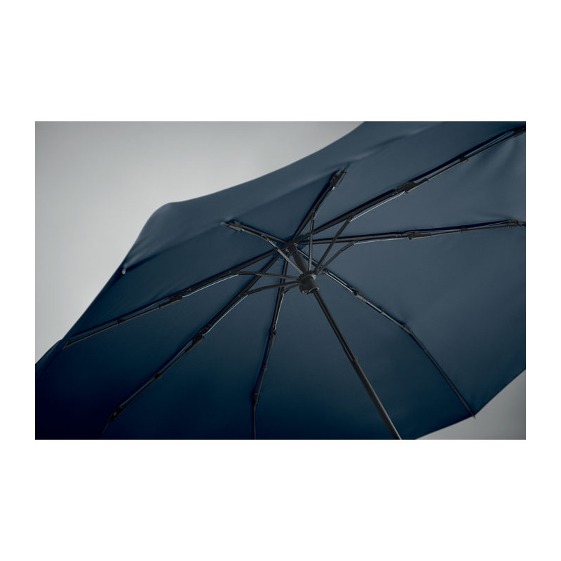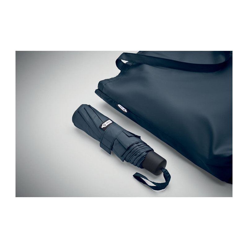 Personalized umbrella in sustainable RPET pongee and windproof. Innovative design with integrated shopping bag and hidden compartment to easily carry your shopping.