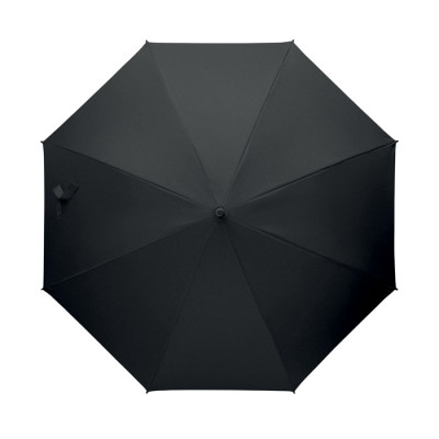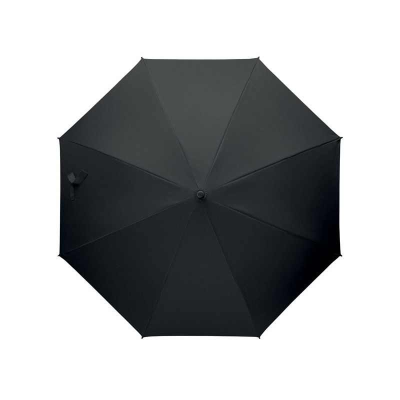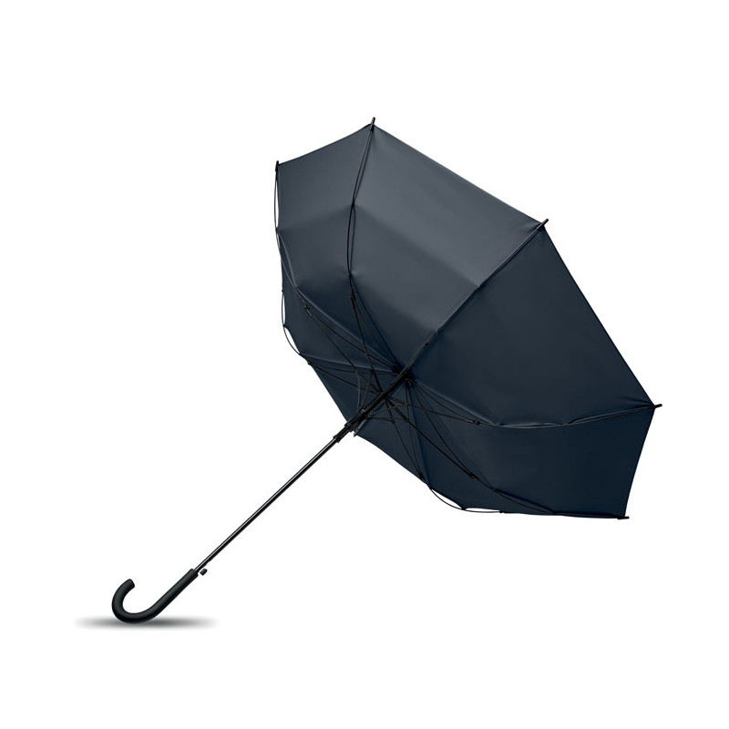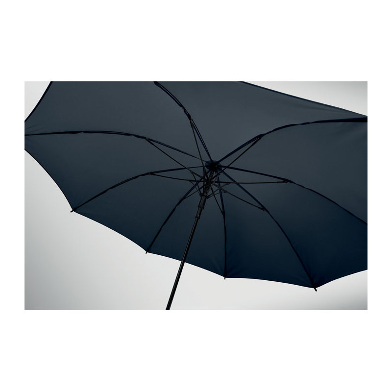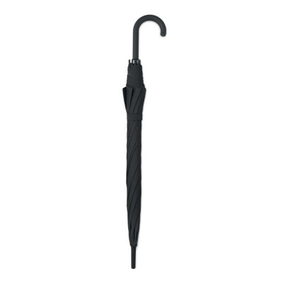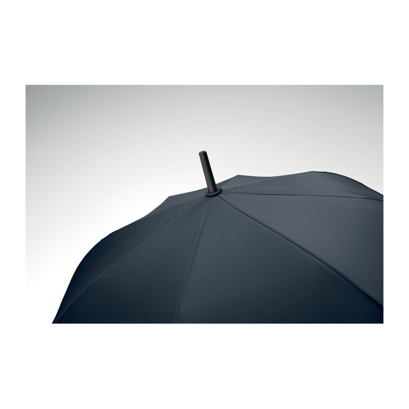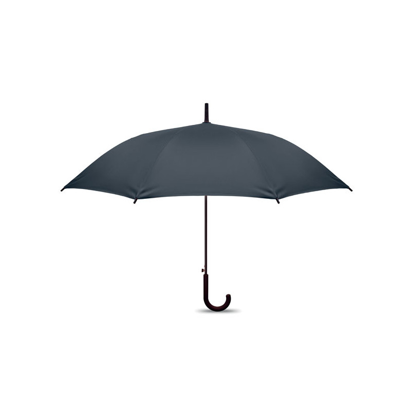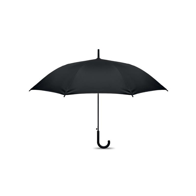 23 inch straight auto open windproof umbrella with full fibreglass frame and panels in 190T pongee fabric. Plastic tips and top. Rubberized PP plastic curved handle. Manual closure.