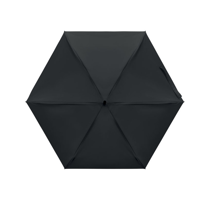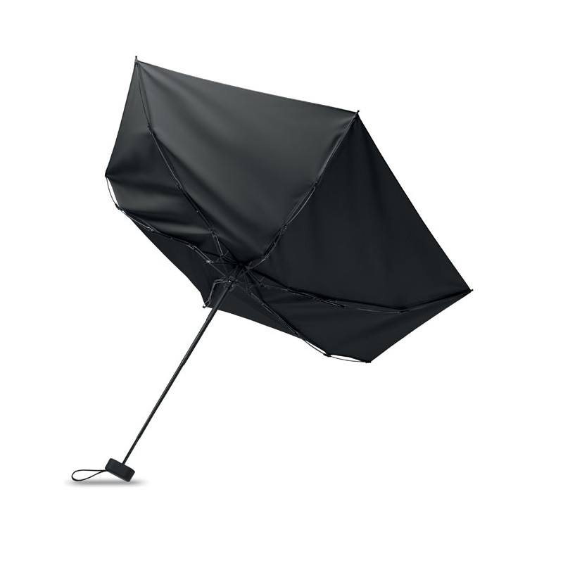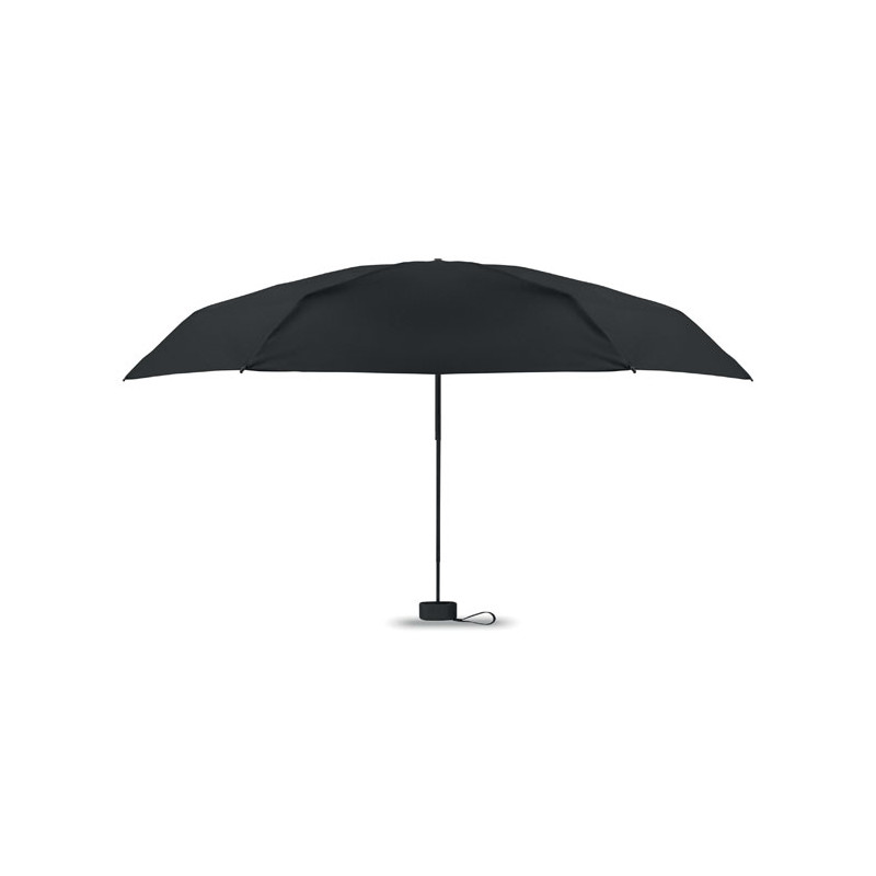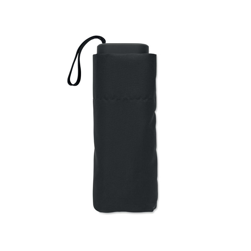 19-inch 5-fold manual umbrella made of 190T pongee with matching pouch. It has a metal and fibreglass windproof frame, black rubberized handle with wrist strap, and compact 17 cm folded size.