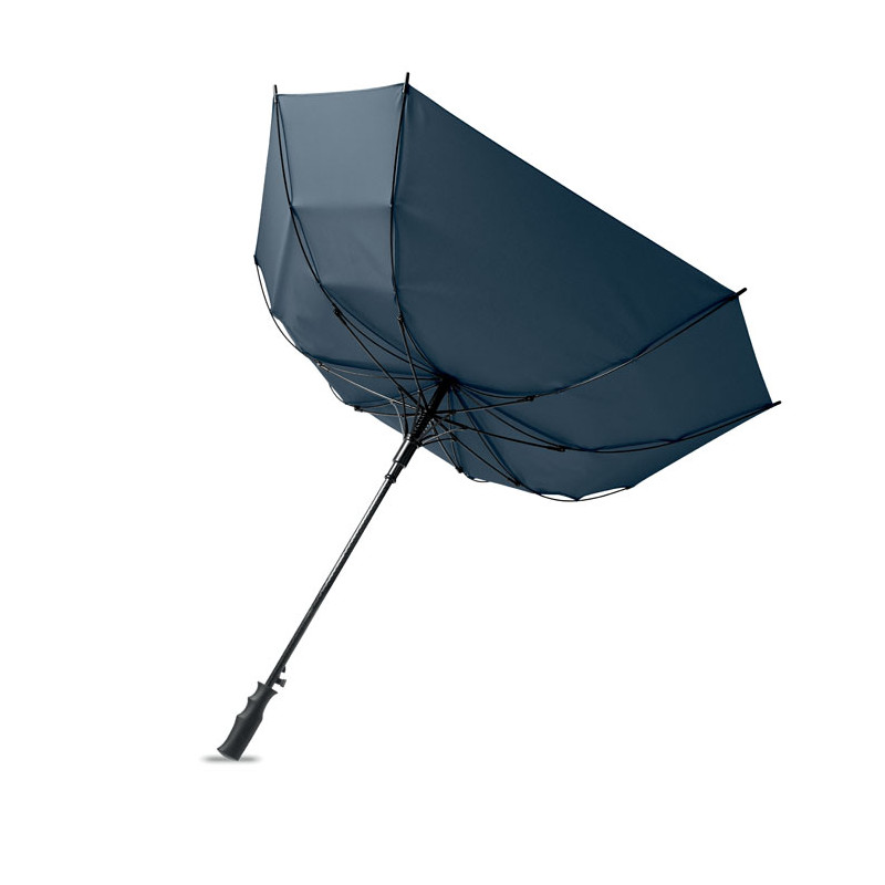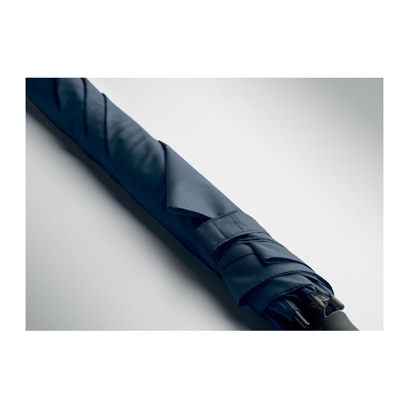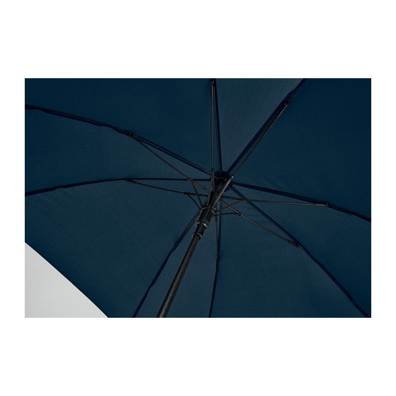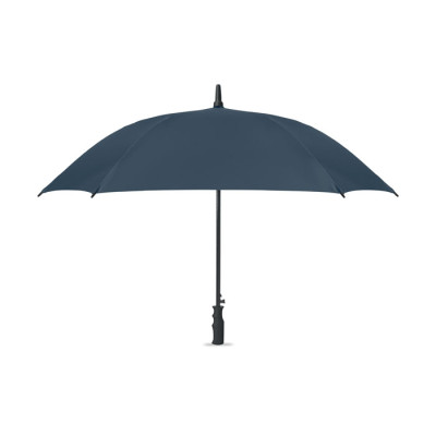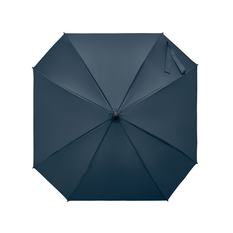 23-inch windproof auto-open square umbrella in 190T pongee polyester. Features full fibreglass frame and ribs, rubber-finished ABS handle.