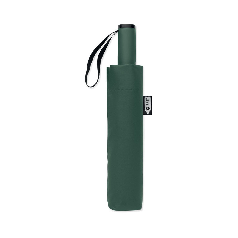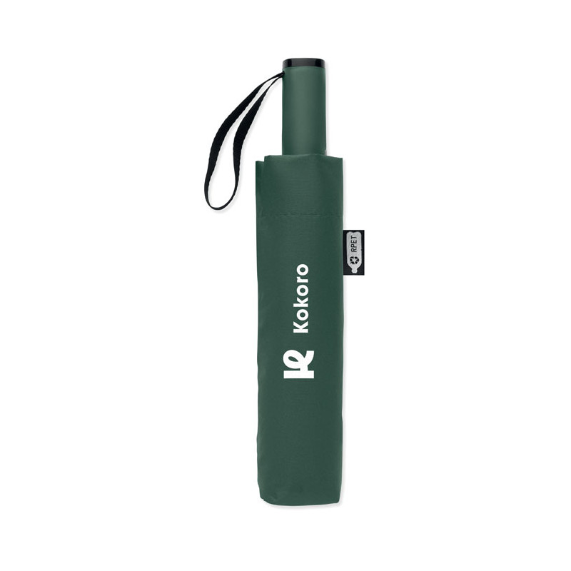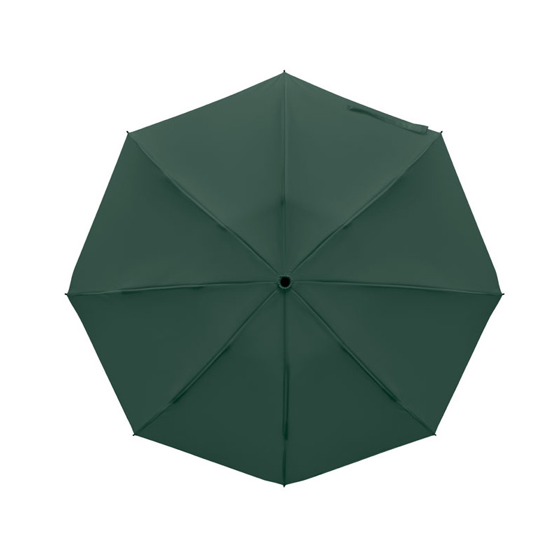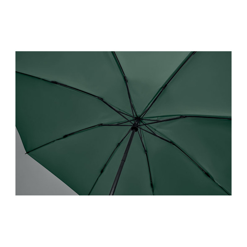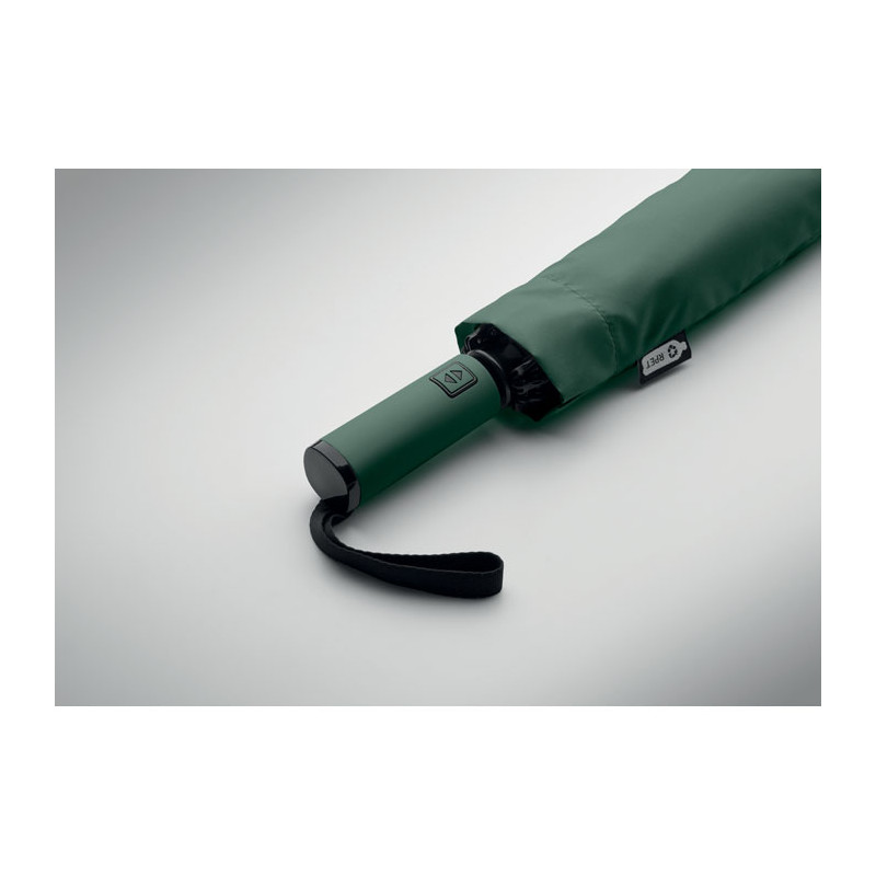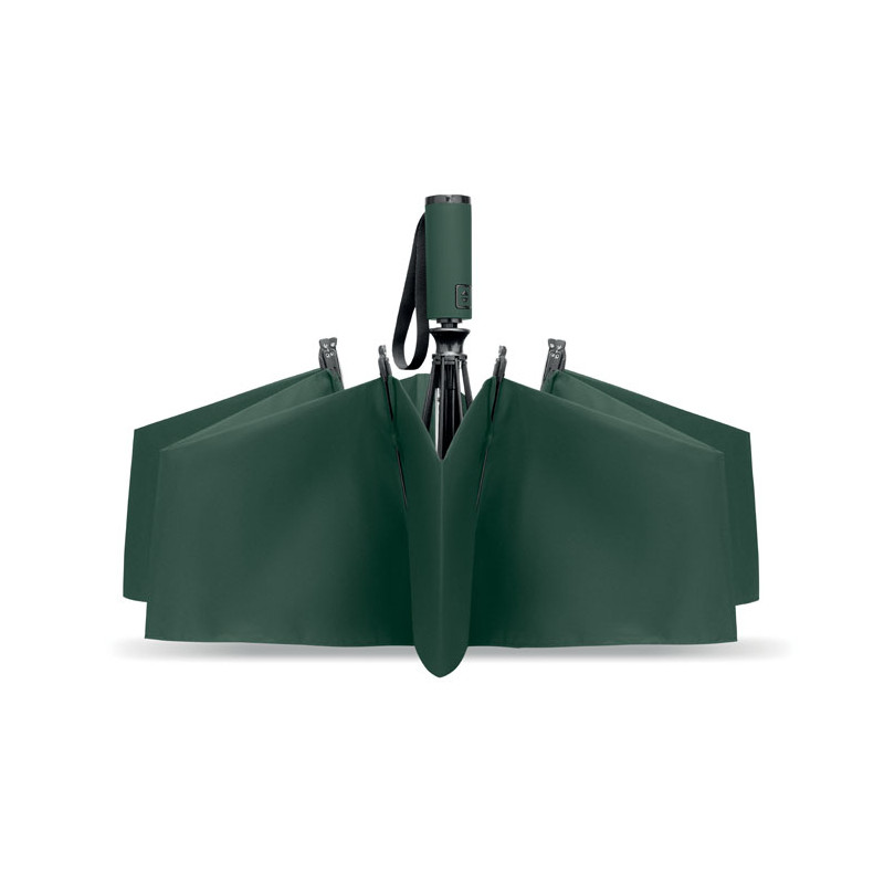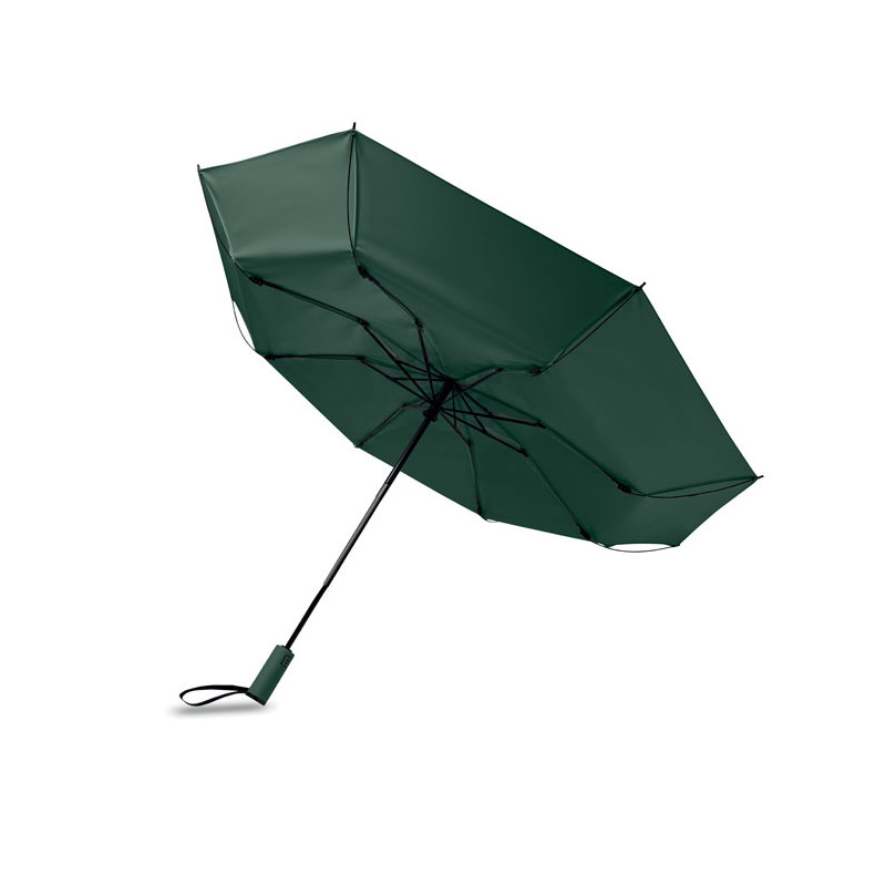 23-inch 3-fold reverse windproof umbrella made of 190T RPET pongee and matching pouch. Auto open and close, full black plating frame, fibreglass ribs, and a rubber-finished ABS handle.