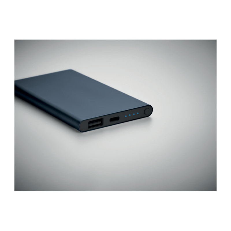 Power bank 4000 mAh capacity in aluminium. Output current DC5V/2A. Includes indicating light and USB cable with Type C.