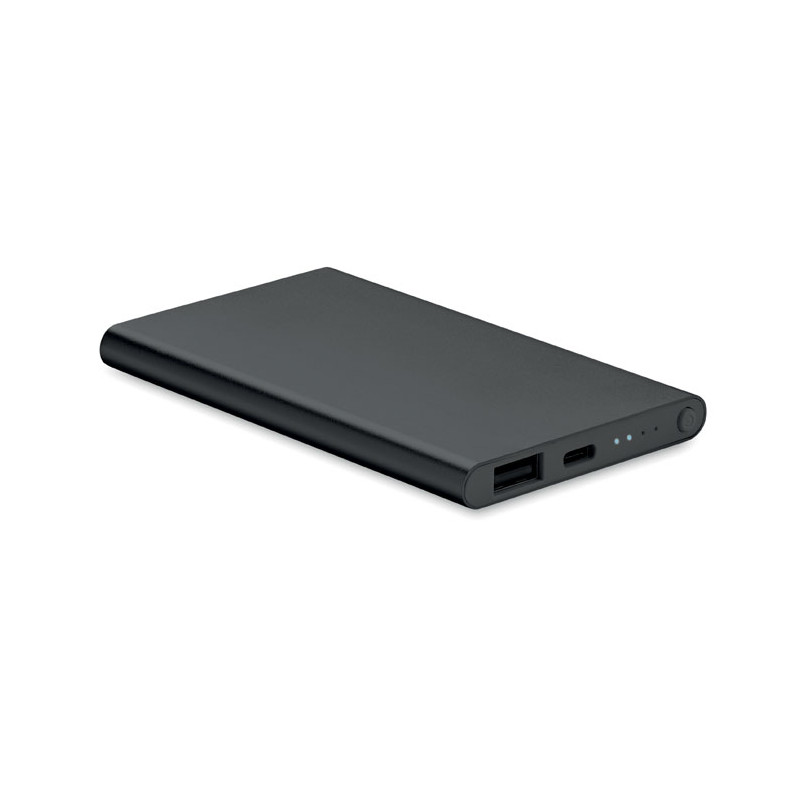 Power bank 4000 mAh capacity in aluminium. Output current DC5V/2A. Includes indicating light and USB cable with Type C.