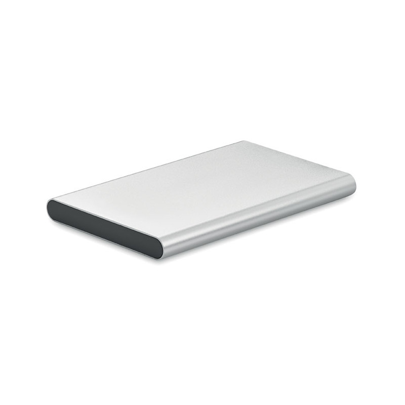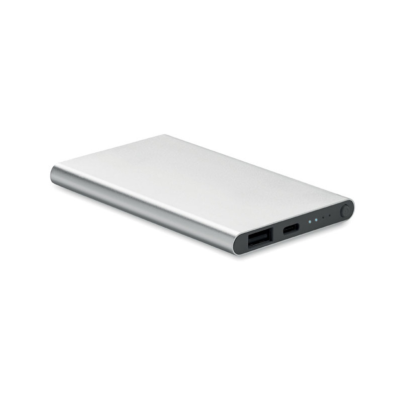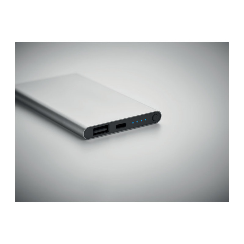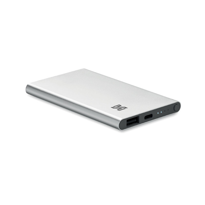 Power bank 4000 mAh capacity in aluminium. Output current DC5V/2A. Includes indicating light and USB cable with Type C.