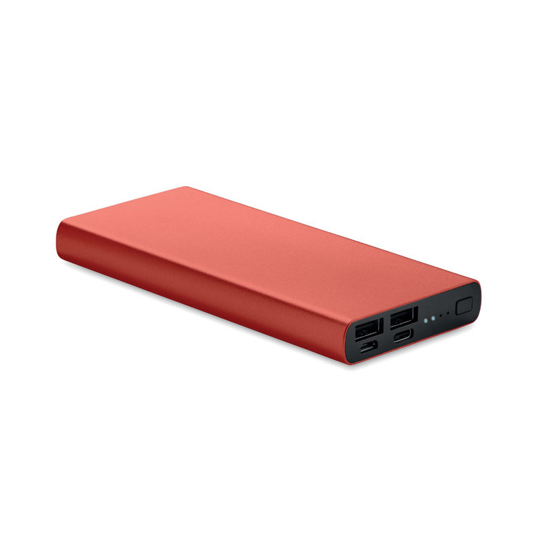 Power bank 10000 mAh in aluminium. Capacity for smartphone use, output current DC5V/1A and DC5V/2A . Includes indicating light and USB cable with micro usb plug. Supports quick charging technology (18W). In/Output: Type-C. Power delivery (PD) support to charge the newest laptop MacPro®.