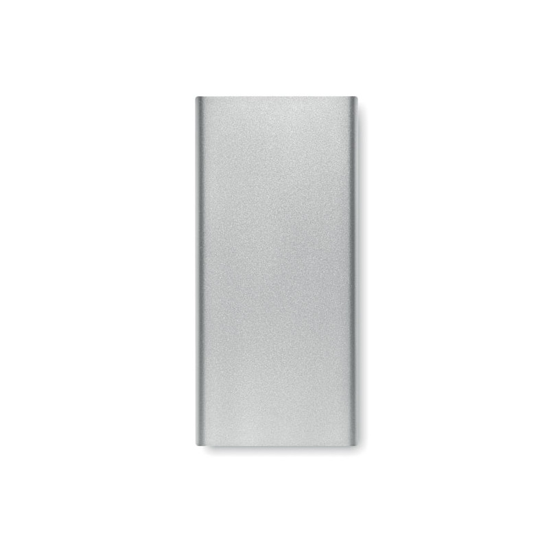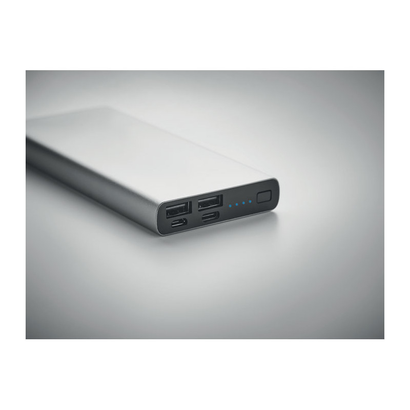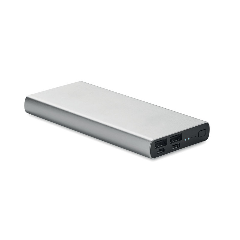 Promotional 10000 mAh powerbank with aluminium frame. It has several USB connections, including type C, and supports fast charging technology.