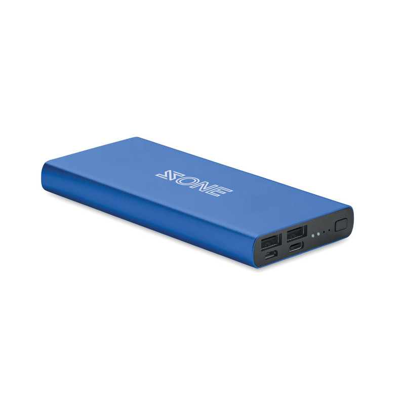 Power bank 10000 mAh in aluminium. Capacity for smartphone use, output current DC5V/1A and DC5V/2A . Includes indicating light and USB cable with micro usb plug. Supports quick charging technology (18W). In/Output: Type-C. Power delivery (PD) support to charge the newest laptop MacPro®.