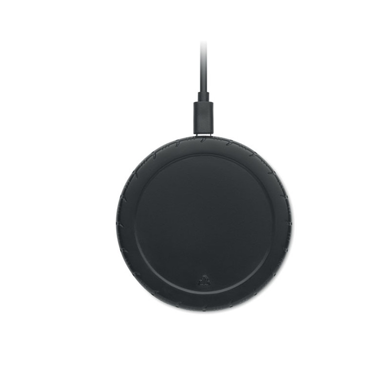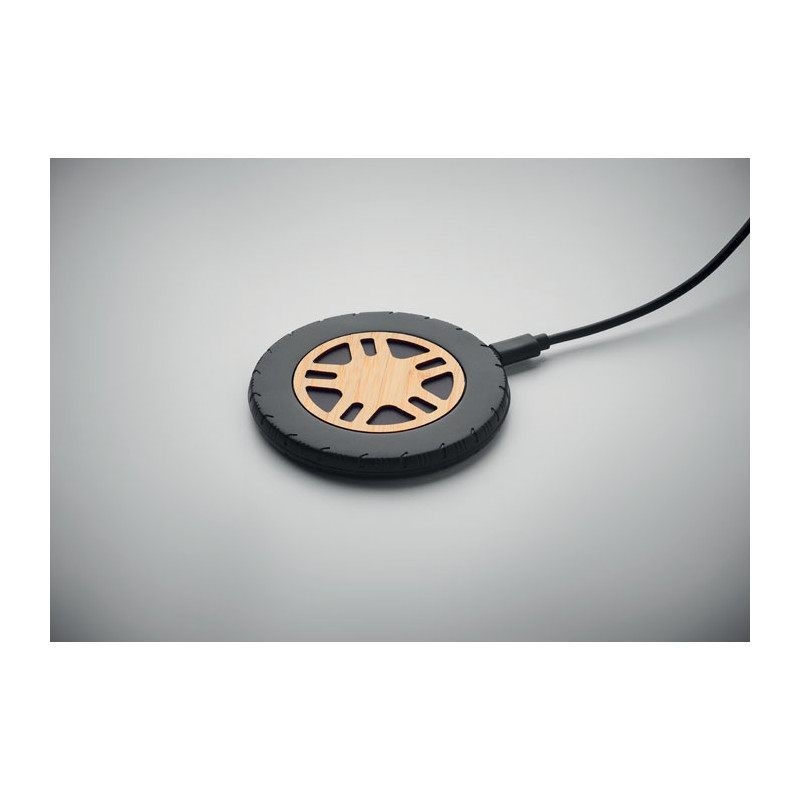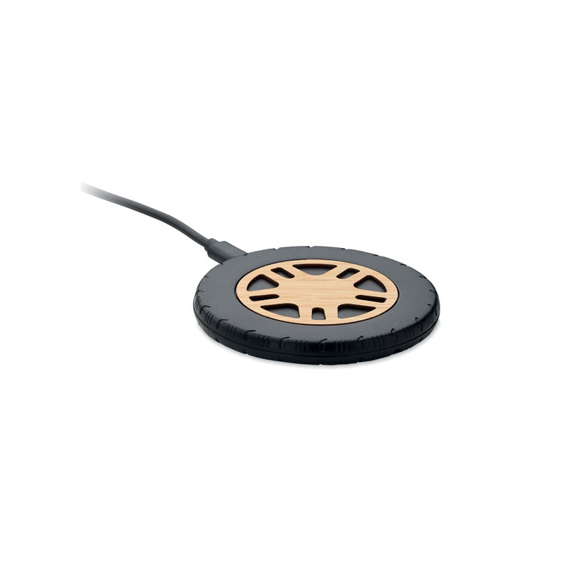 Wireless charger 15W in recycled ABS and bamboo top. Car tire design. Connect device to your computer, place smartphone on it and let it charge. Output: DC 9V/1.10A (15W) for quick charging. Compatible with all QI enabled devices such as latest Androids, iPhone® 8, X and newer.