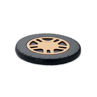 Wireless charger with tire-shaped design, perfect for charging gadgets. Ideal promotional gift for automotive events with logo.